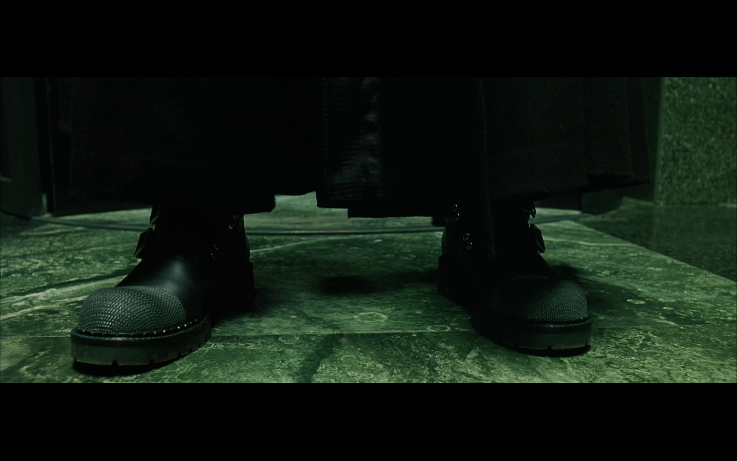 One thing Colin really liked about this film is the motif of feet. Like this shot of Smith getting out of the garbage truck at the beginning. Which sets us up nicely for the next film (a shot that may end up on our shots list, in fact). Or this shot, of Keanu’s boots walking into the building, which we see and go, “Oh yeah, shit is about to go down!”