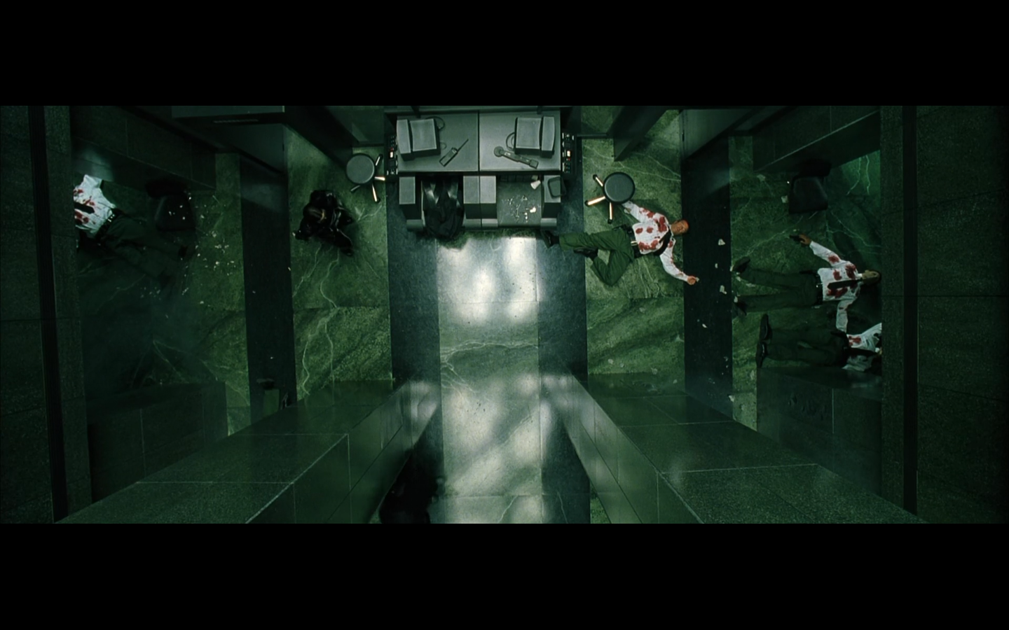 Just to explain this — the idea is that the Wachowskis chose really interesting angles from which to shoot scenes, and it made for much more memorable shots throughout the film, rather than if they chose conventional angles. A lot of times (like in this first shot), they really only go there once or twice. But you remember the shots, and if they do go back to them twice (like they did with this first shot), it’s to pay it off from earlier. And it just makes for a more rewarding viewing experience.