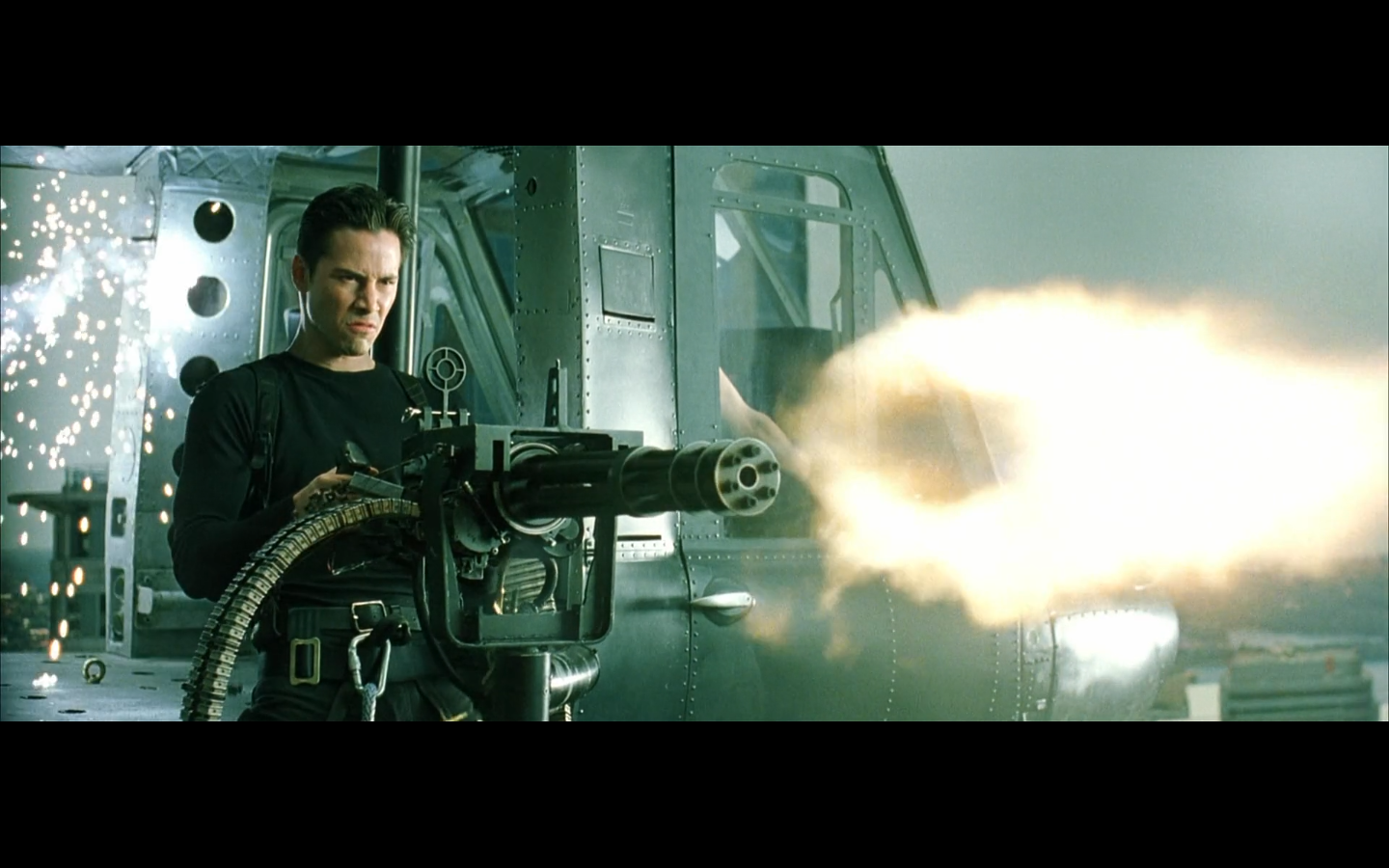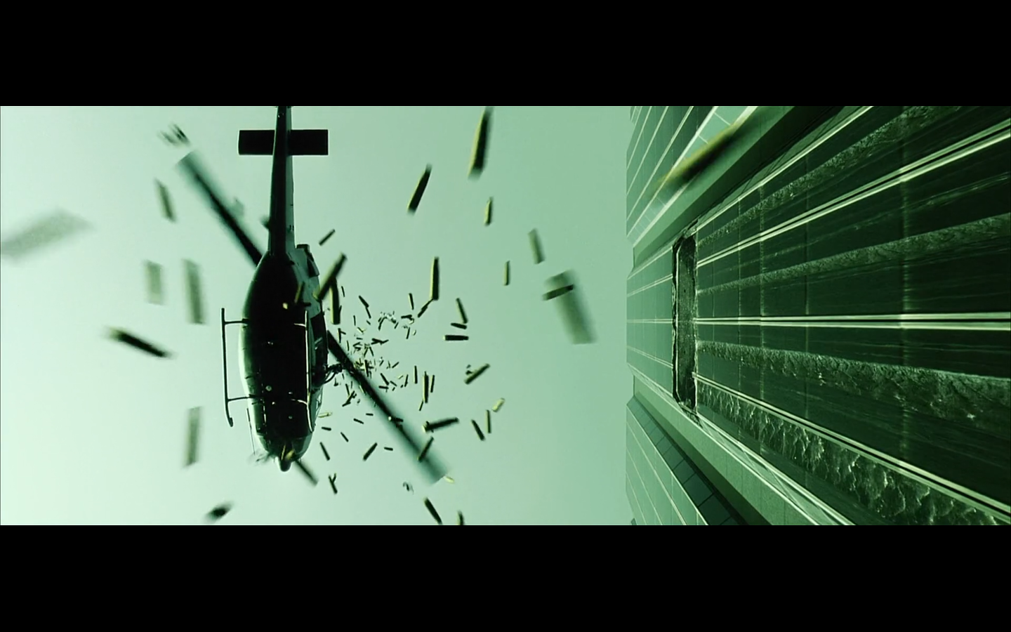 I’m using this one specifically because — they shoot this from a single angle. It’s a helicopter crashing into a building across the street and exploding, and Trinity swinging away from it on a rope held by Neo who is on the roof. And I love that they shot it not just from the building across the street, but from inside the building. And the fact that they showed the glass breaking is just really incredible. It’s that little detail that makes you remember the shot. And it’s the little things like that which are missing from modern action movies and are why everything today seems sterile and boring in big budget action movies.