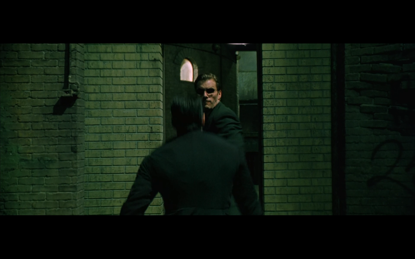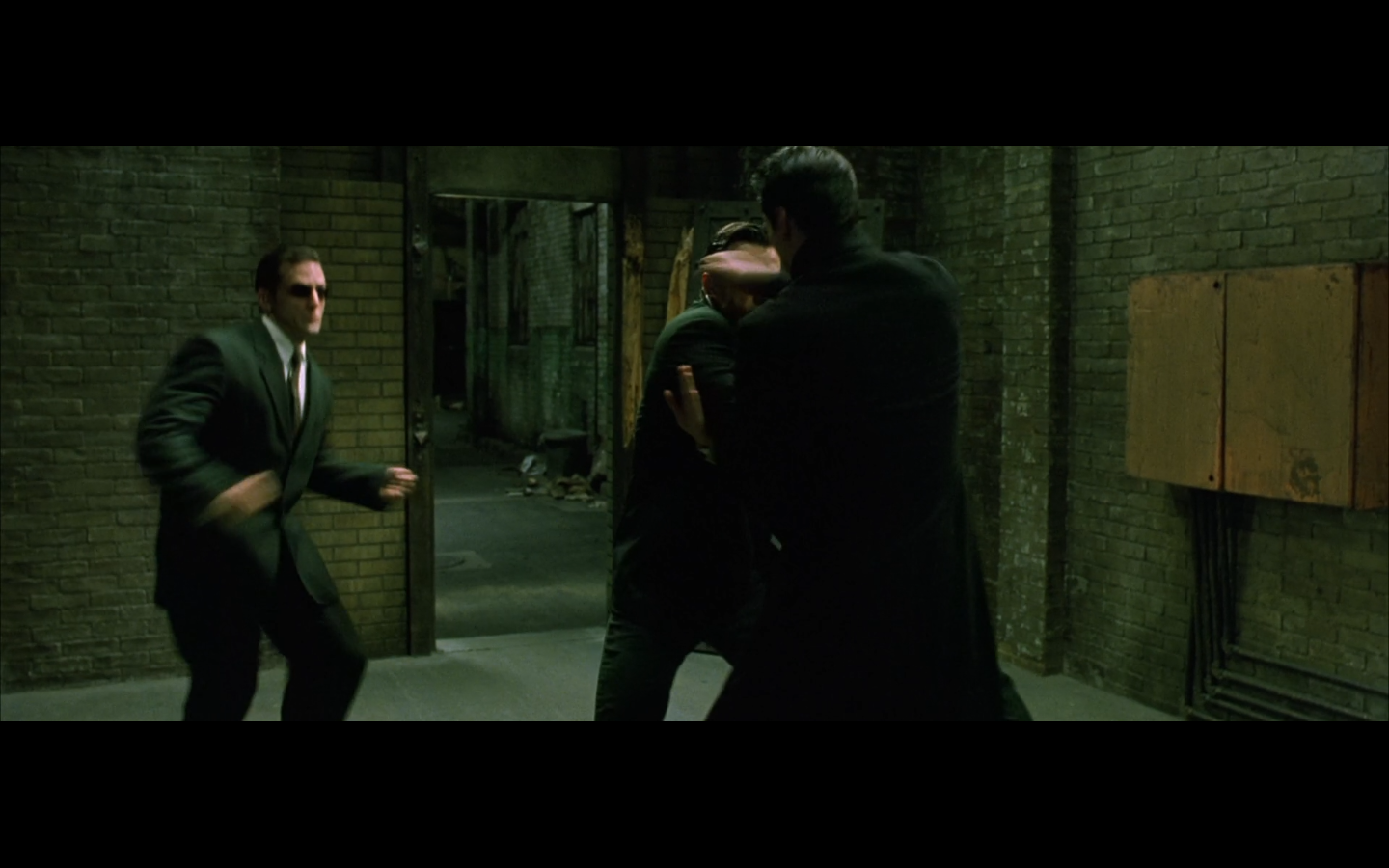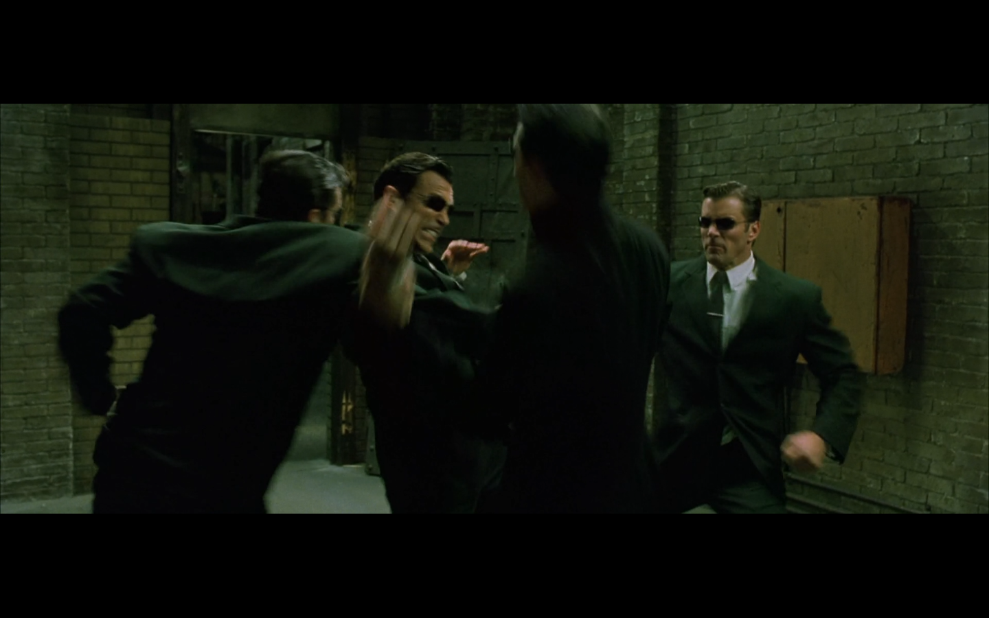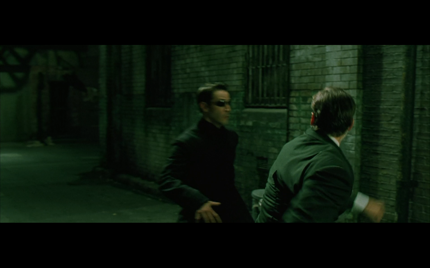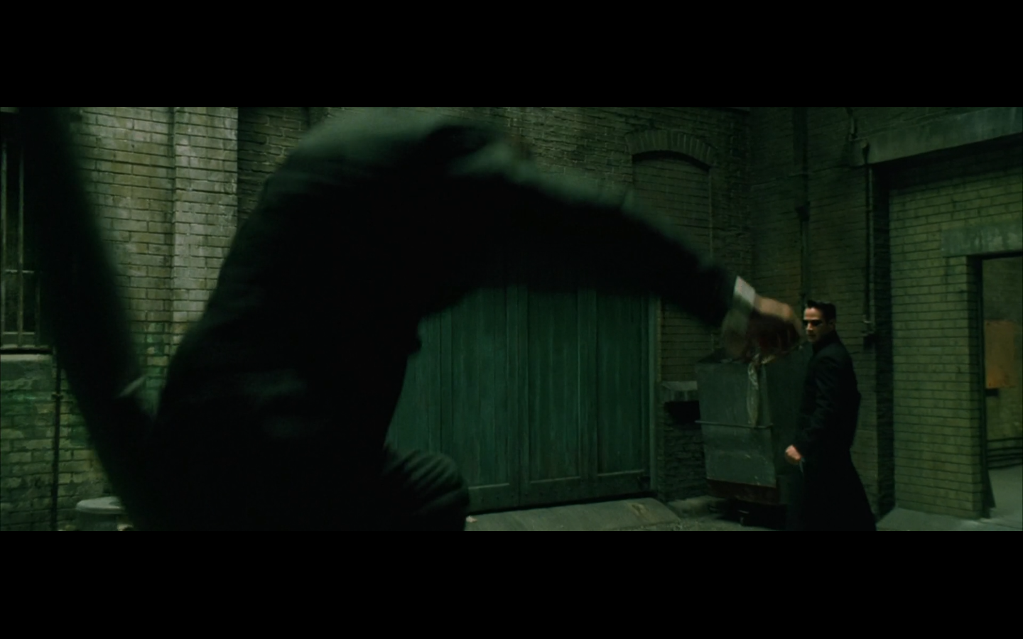 The typical “random civilian dude from the Matrix turns around in shock at some shit our protagonists do” shot.