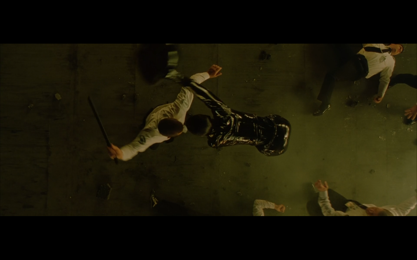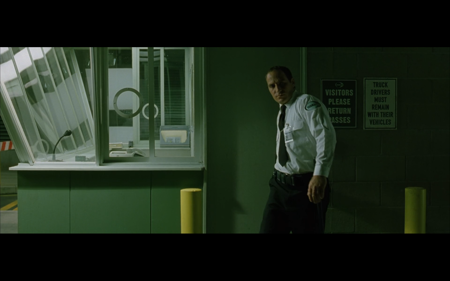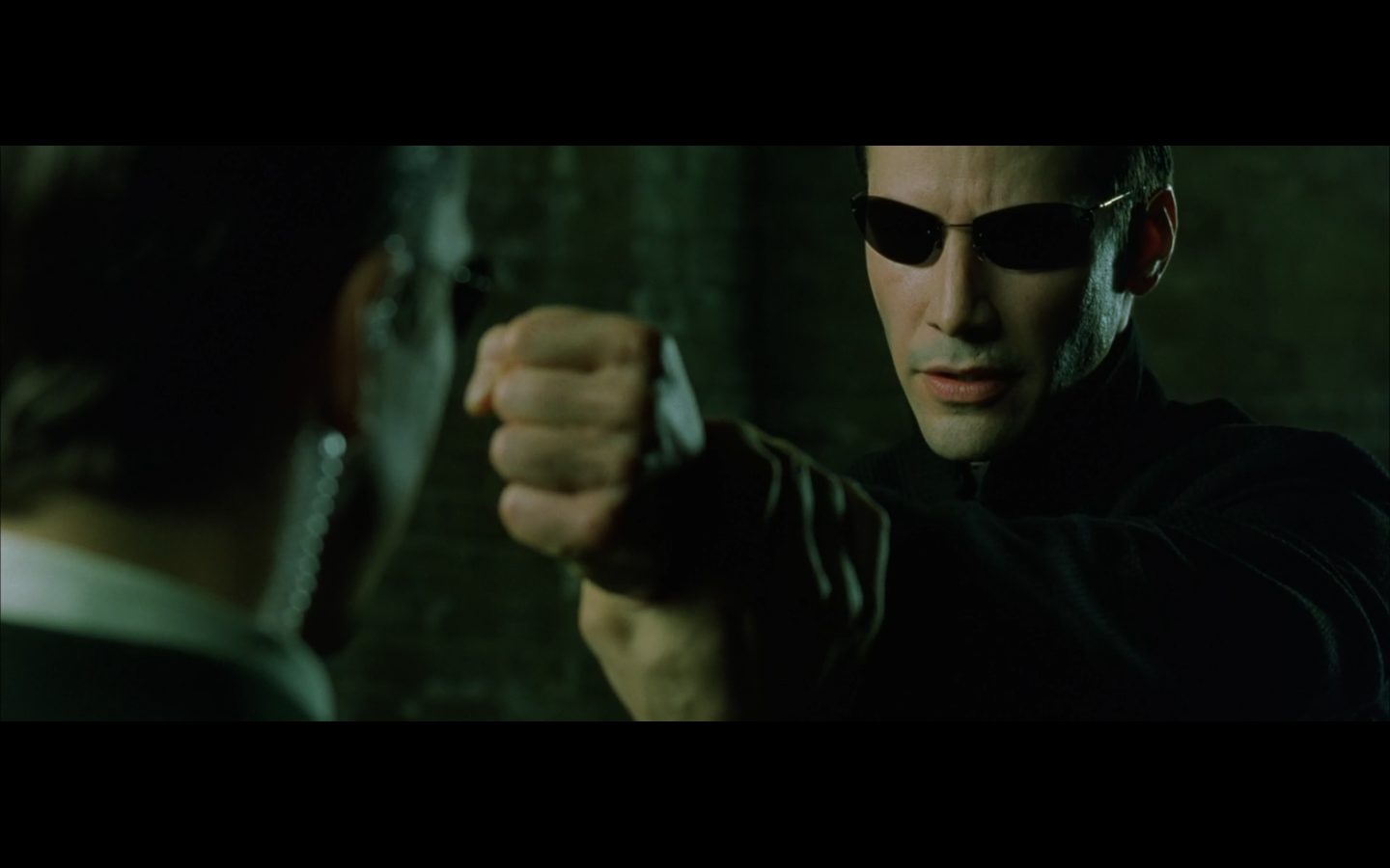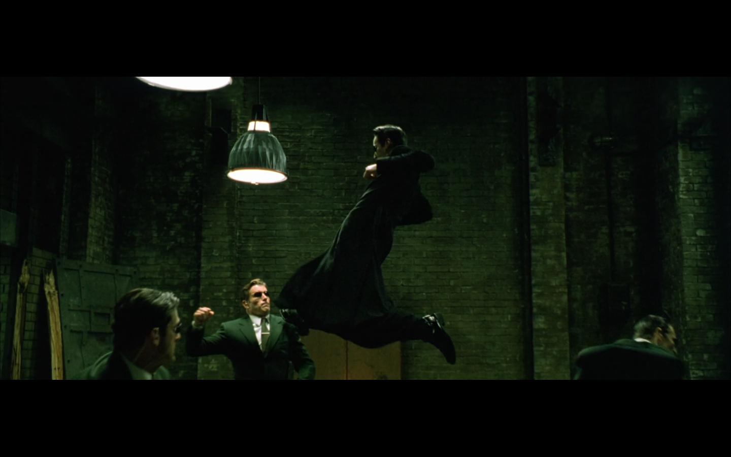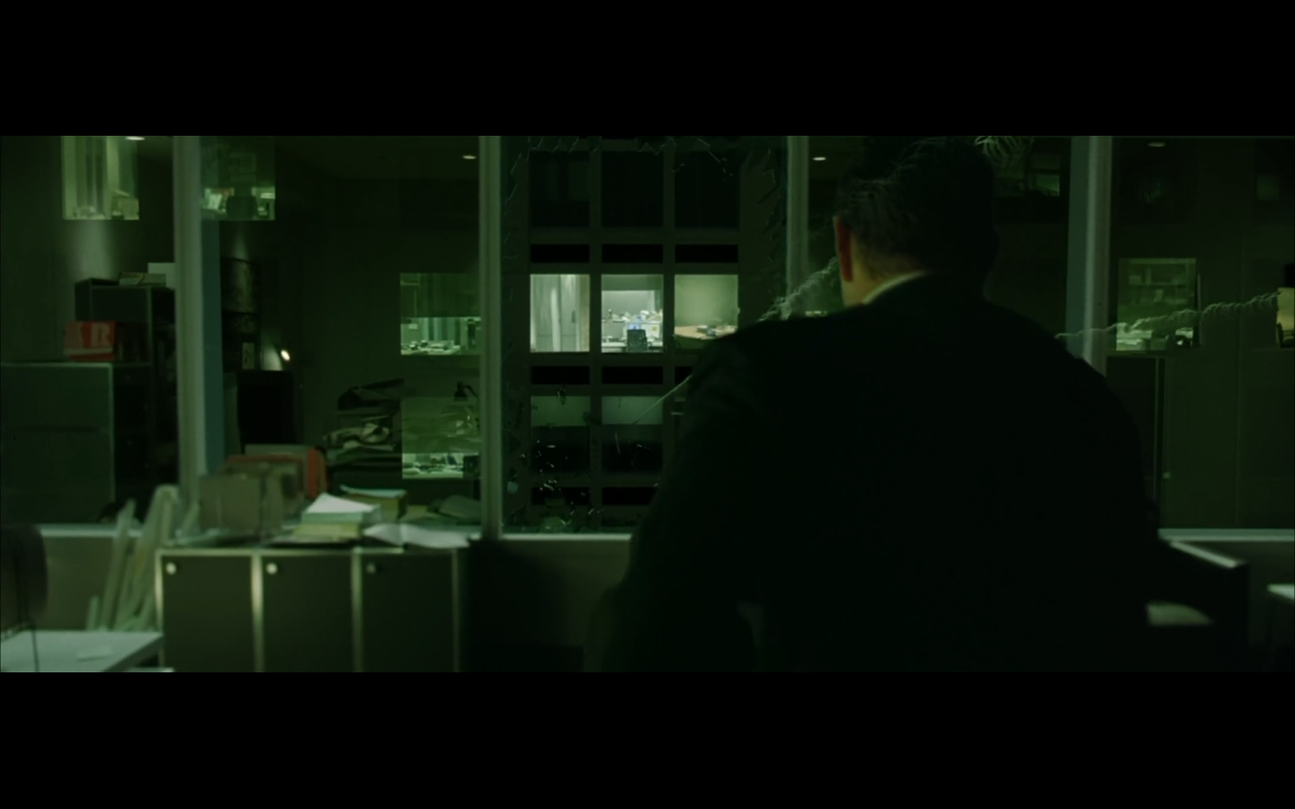 The typical “random civilian dude from the Matrix turns around in shock at some shit our protagonists do” shot.