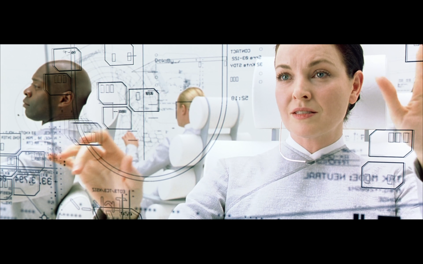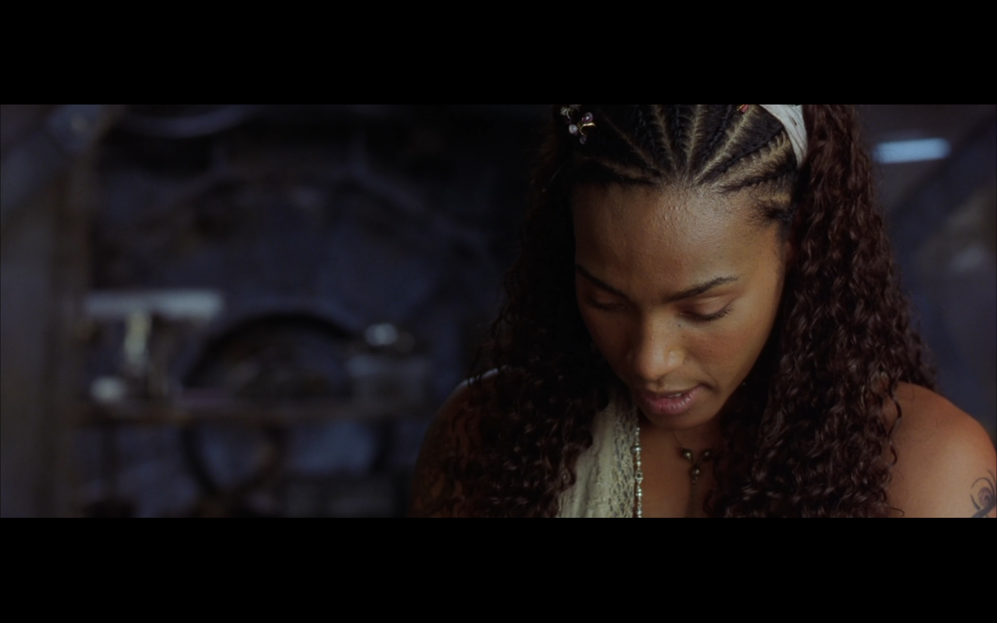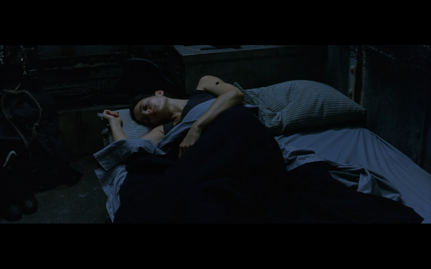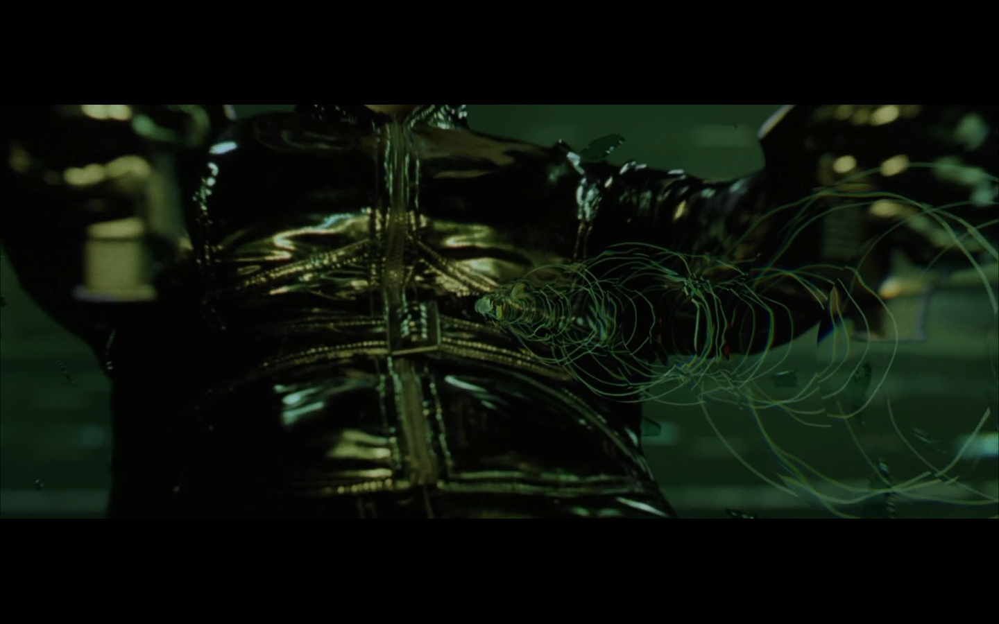 I just realized that this is only not creepy cause she doesn’t get a full-frontal. We know from seeing Neo plugged in during the first film that in place of nipples, humans now have “holes.” So she has titties tipped with those gross sockets. How sexy is that, Neo? You into that?