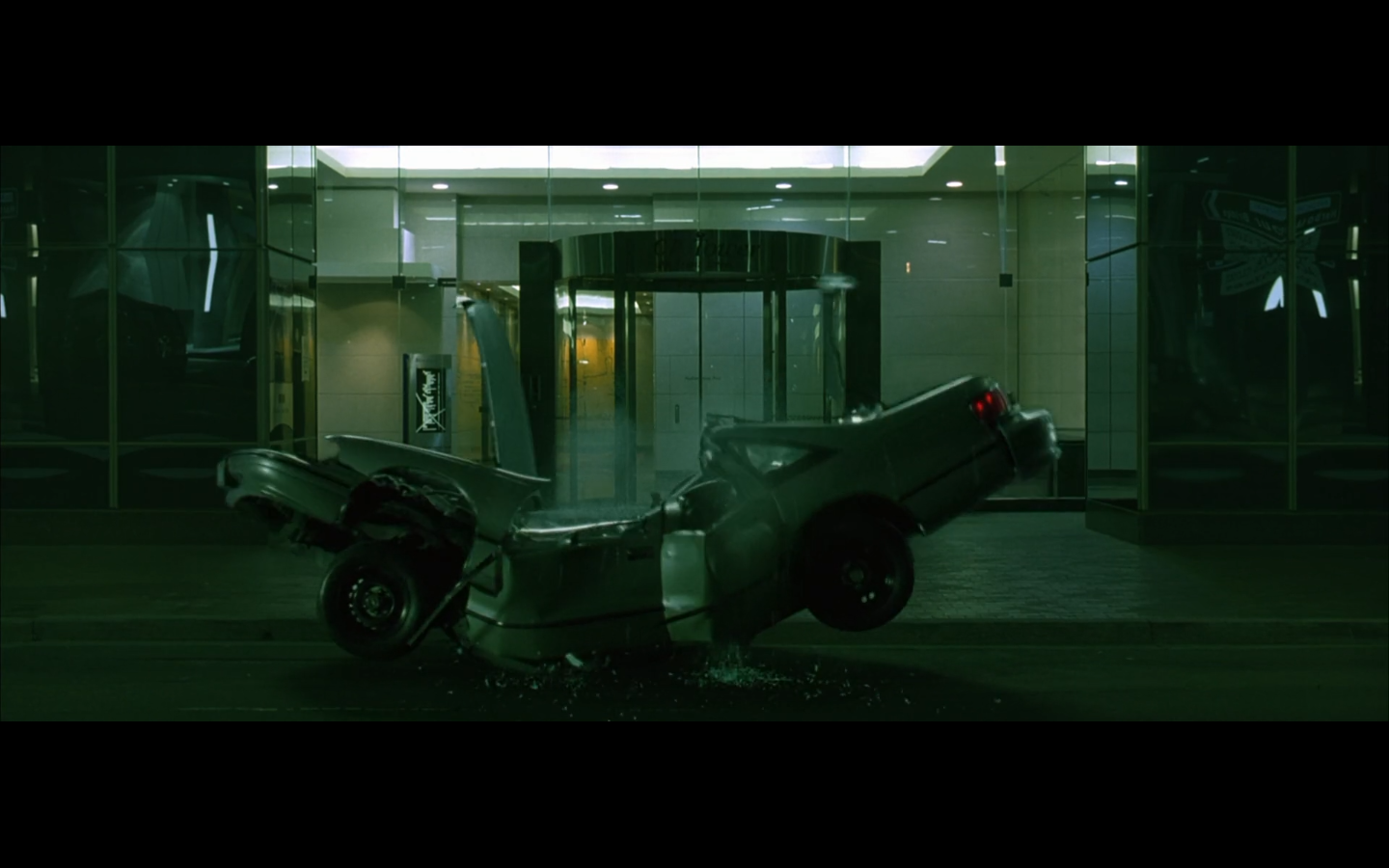 Apparently when objects hit other objects in the Matrix, they just explode.