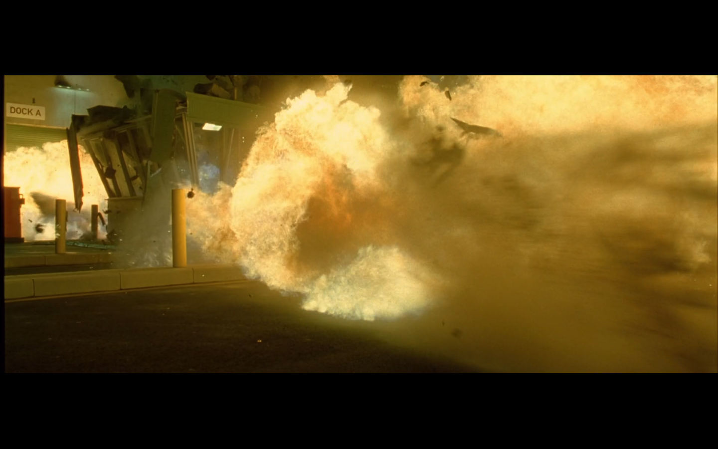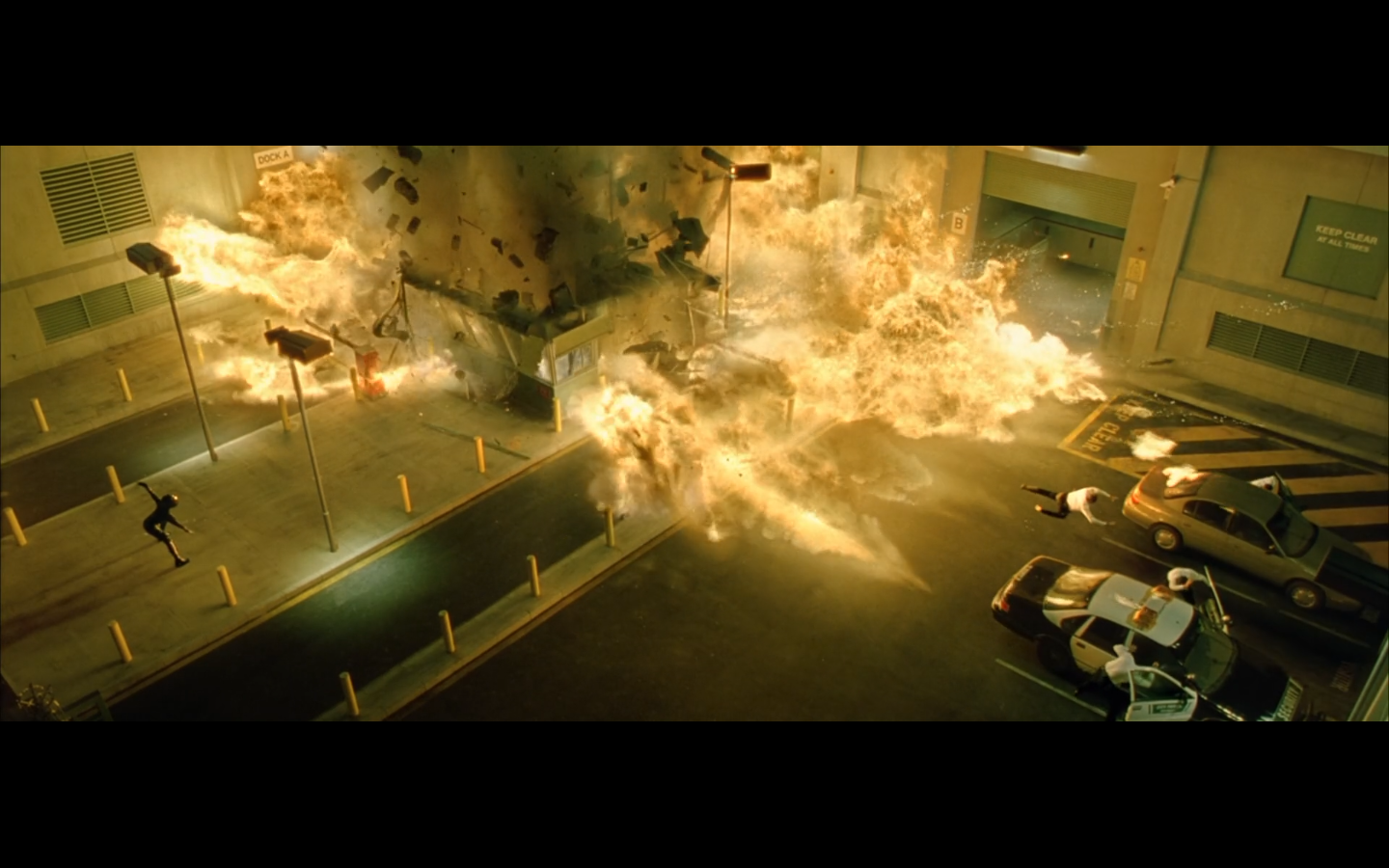 Seriously, did they rig the bike with explosives to do this? Cause shit does not blow up like that. Was this little security hut also storing propane tanks? Aw, the punch-clock got blown up.
