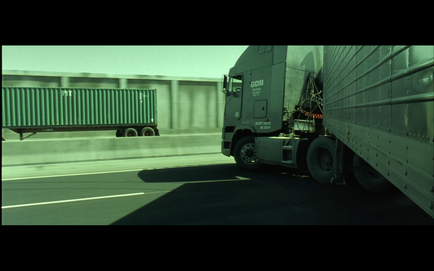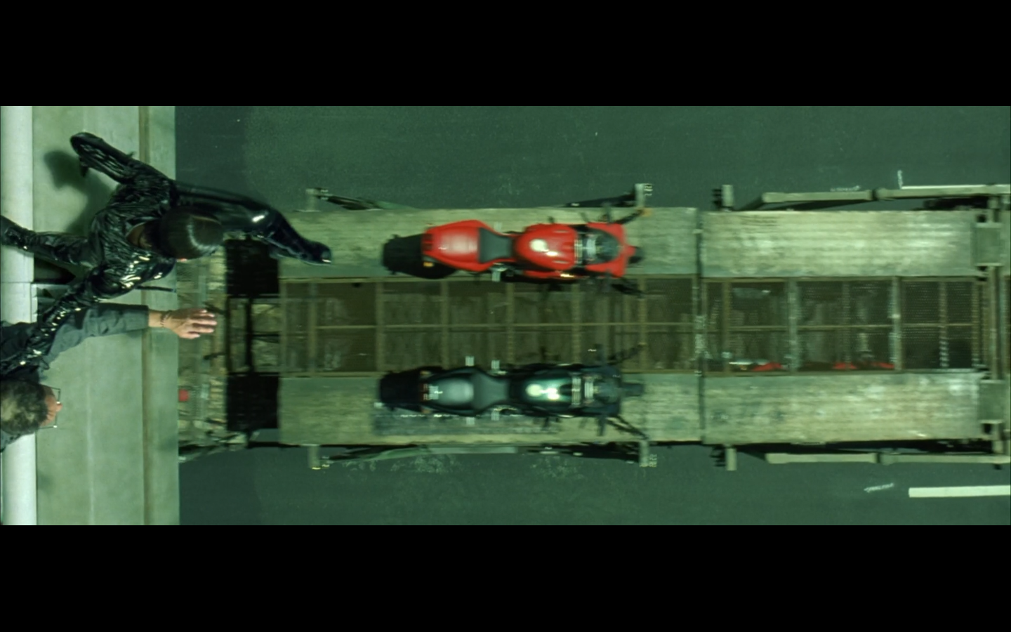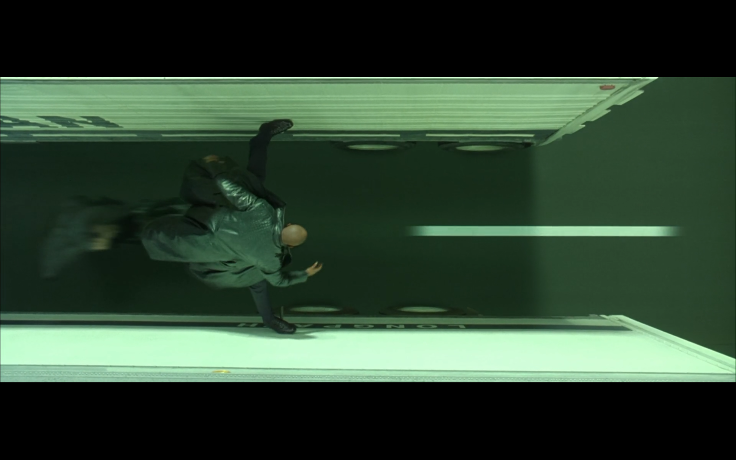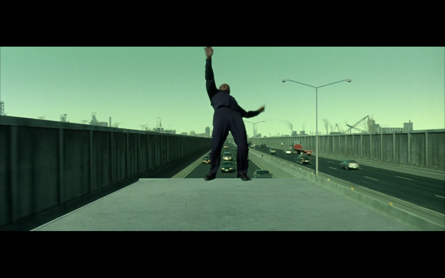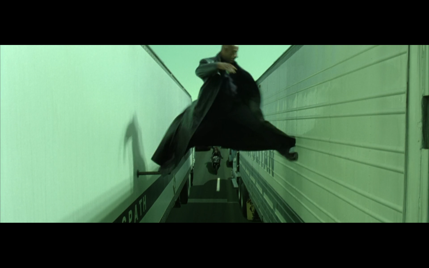 This is funny to me, cause where are you going? They’re on the top of a moving semi, and Morpheus is still like, “I’m parked over by the commissary.”