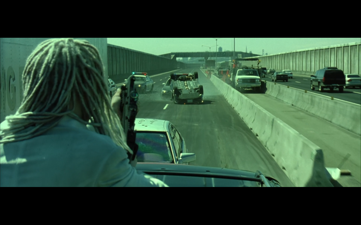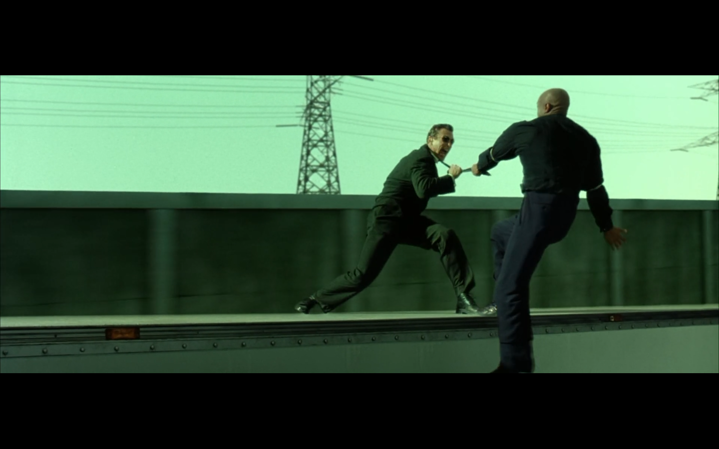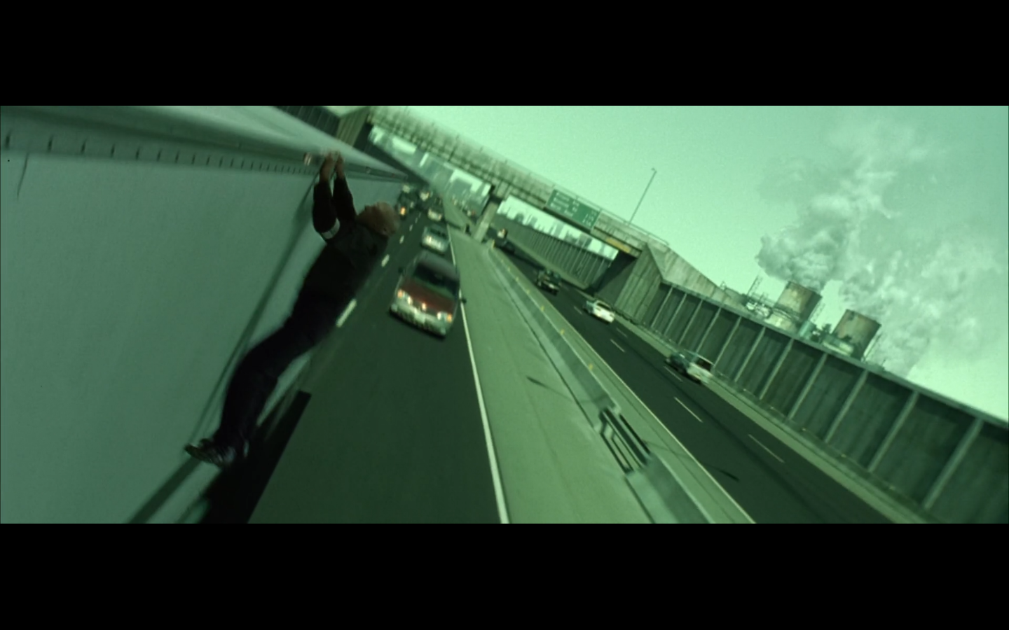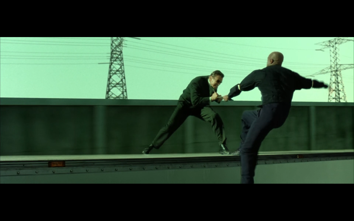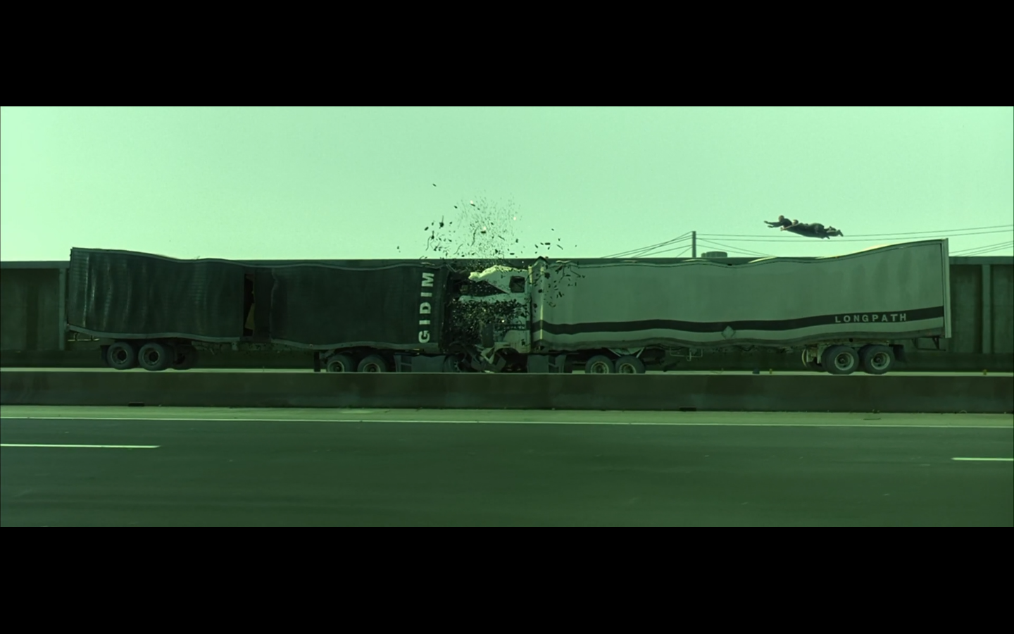 This is funny to me, cause where are you going? They’re on the top of a moving semi, and Morpheus is still like, “I’m parked over by the commissary.”