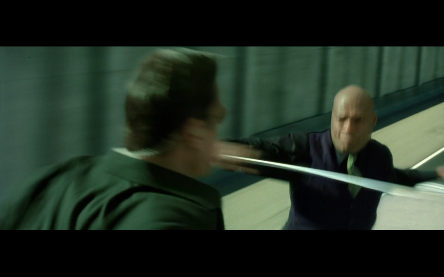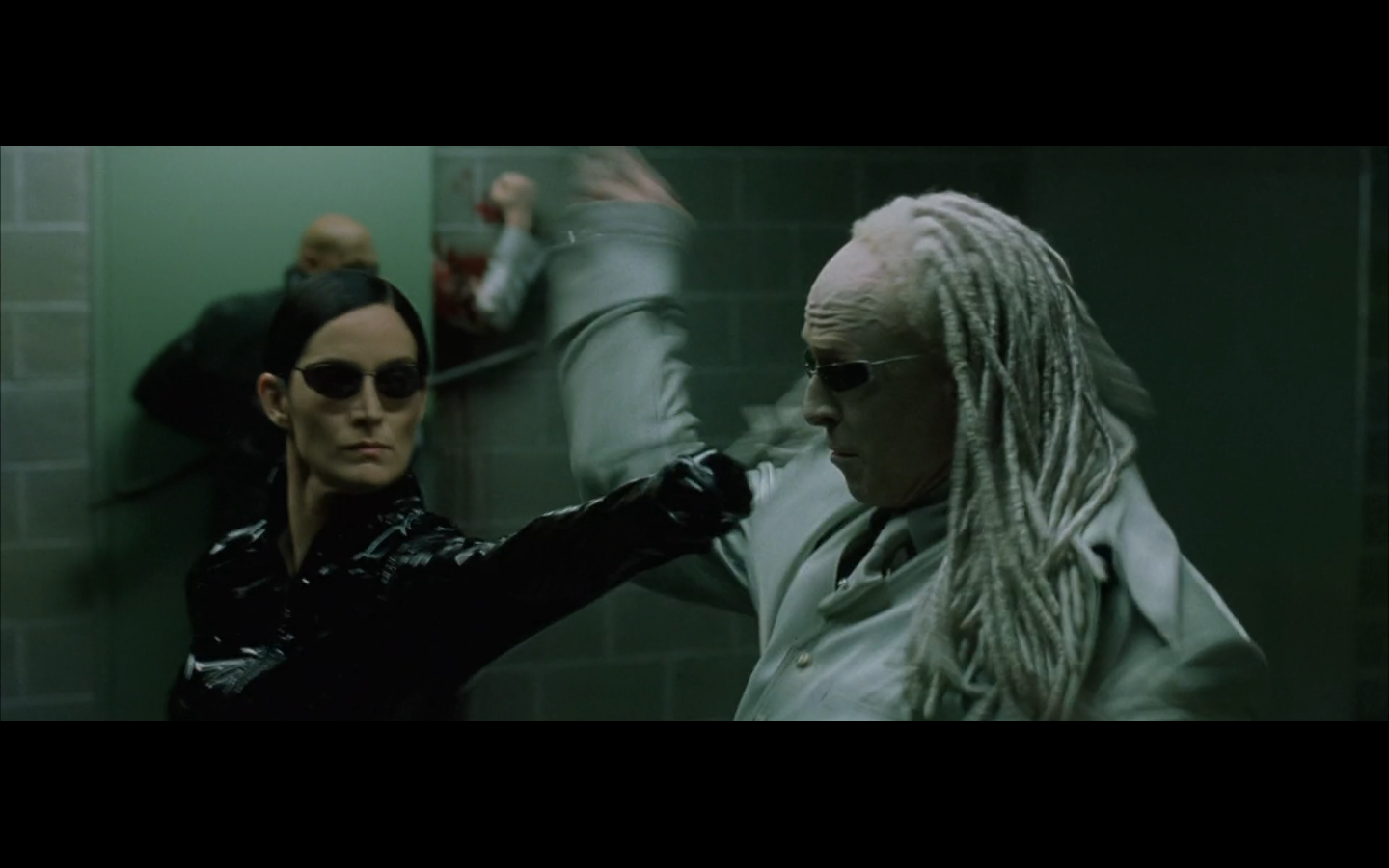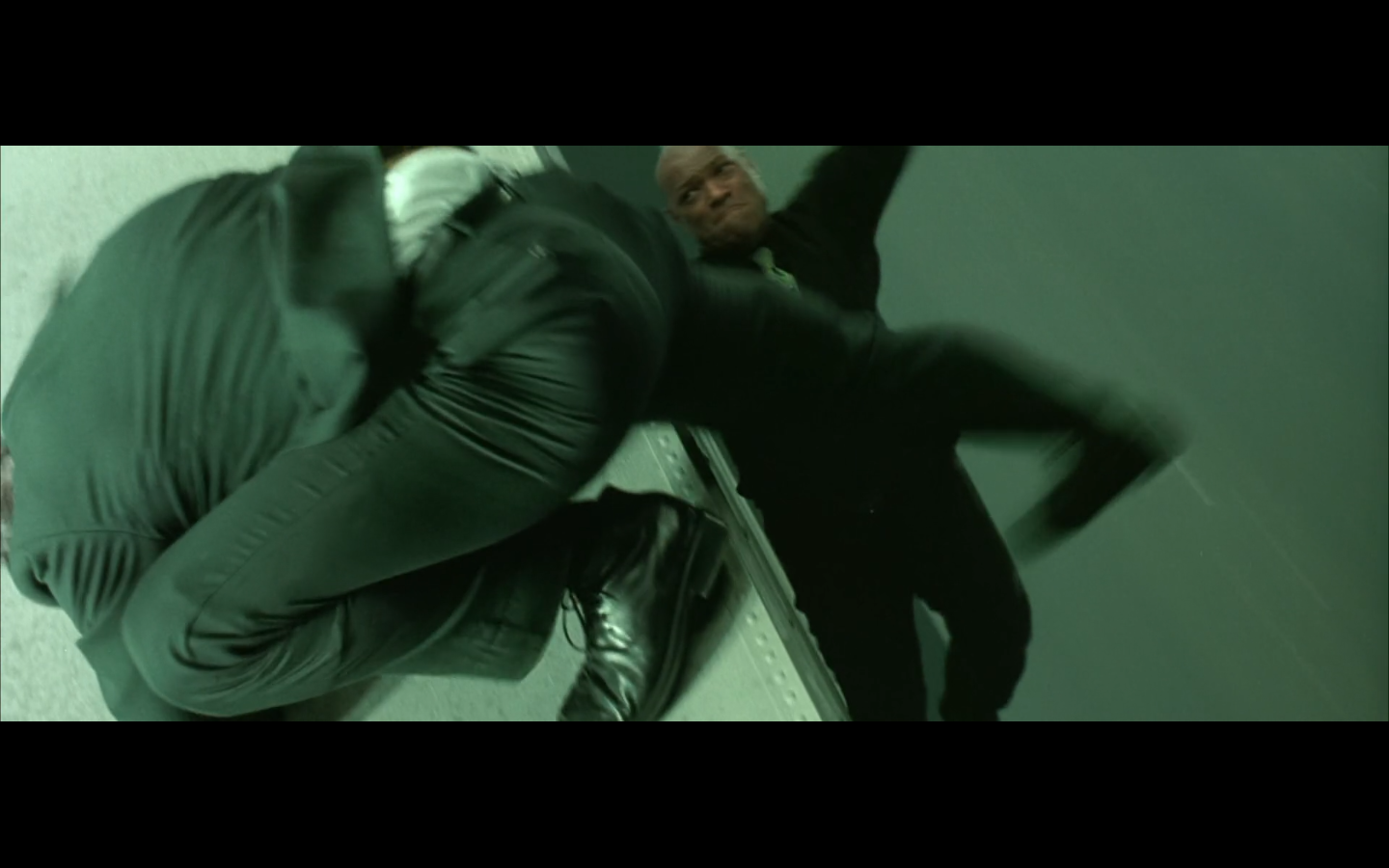 Have they even given us rules for how this works? Because he actually could just have done the ghost thing the whole time. Is the door some kind of program thing that prevents him from doing it until he goes through? Because it didn’t prevent the other guy from going through his arm when he flew through the door? Are we even bothering to deal with consistency here? Because I’m still wondering how Morpheus stopped to pick up the katana and then made it ahead of the guy in time to close the door on him.