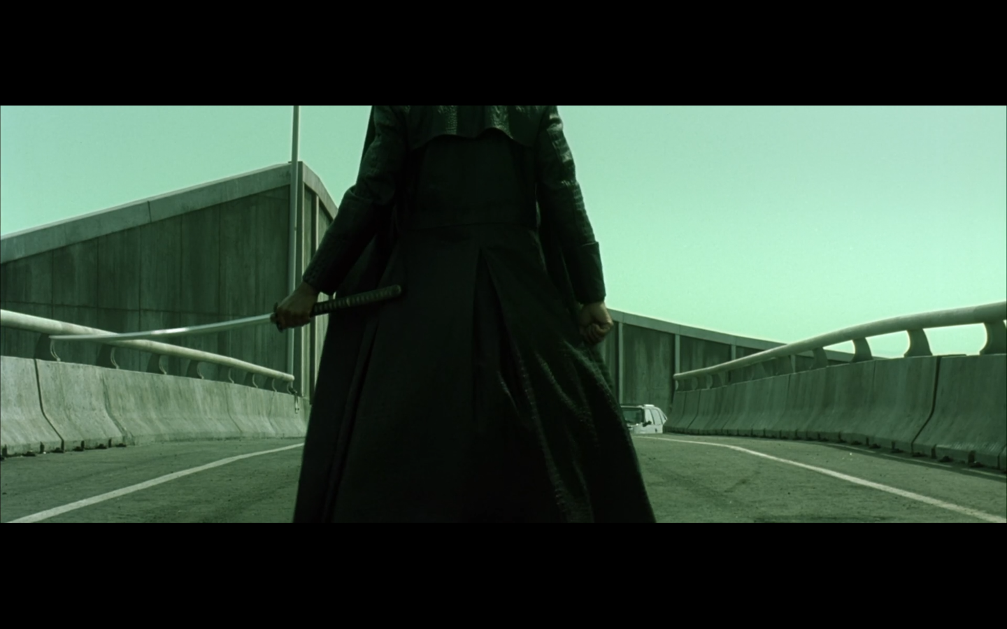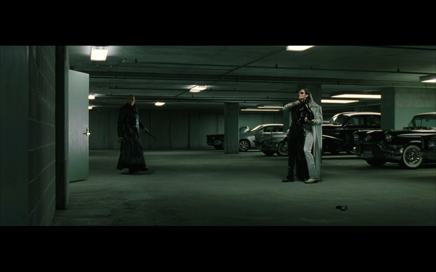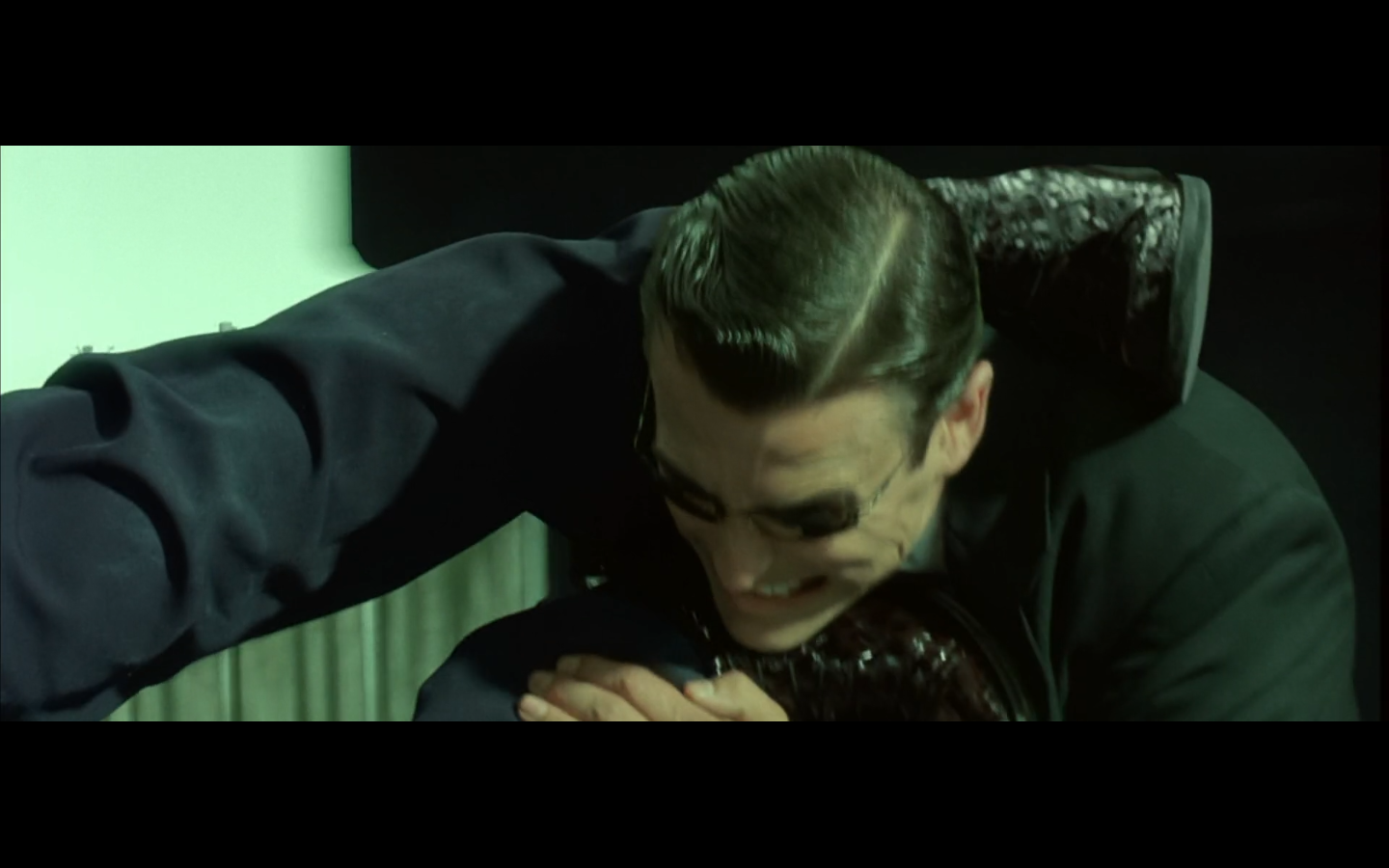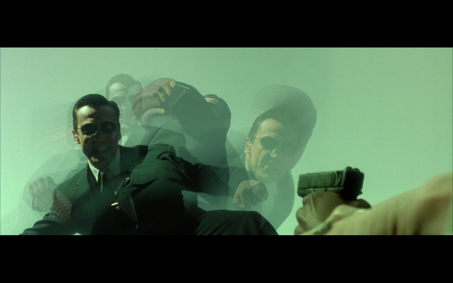 Have they even given us rules for how this works? Because he actually could just have done the ghost thing the whole time. Is the door some kind of program thing that prevents him from doing it until he goes through? Because it didn’t prevent the other guy from going through his arm when he flew through the door? Are we even bothering to deal with consistency here? Because I’m still wondering how Morpheus stopped to pick up the katana and then made it ahead of the guy in time to close the door on him.