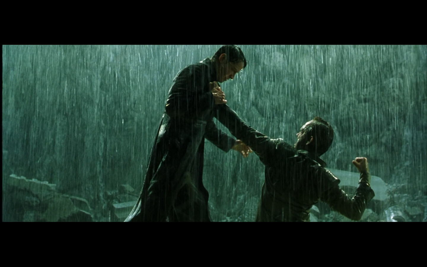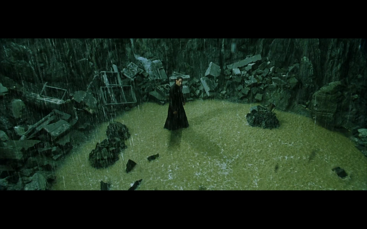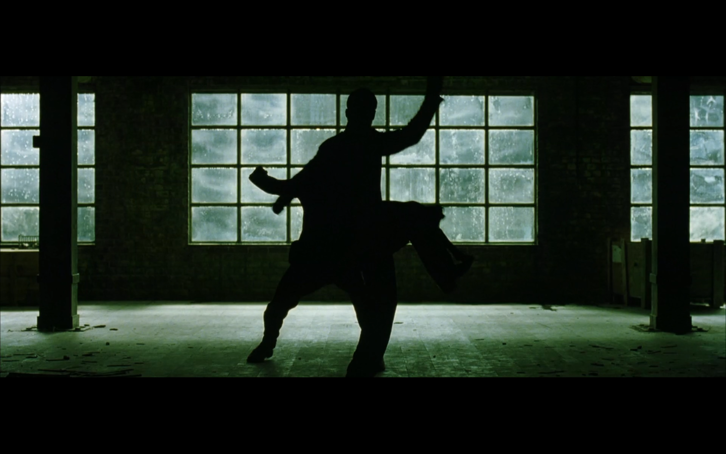 — The canted angle shot of him standing over Neo in the crater. Which is great. Also kind of reminds me of Se7en, when John Doe is standing over Pitt in the alleyway.