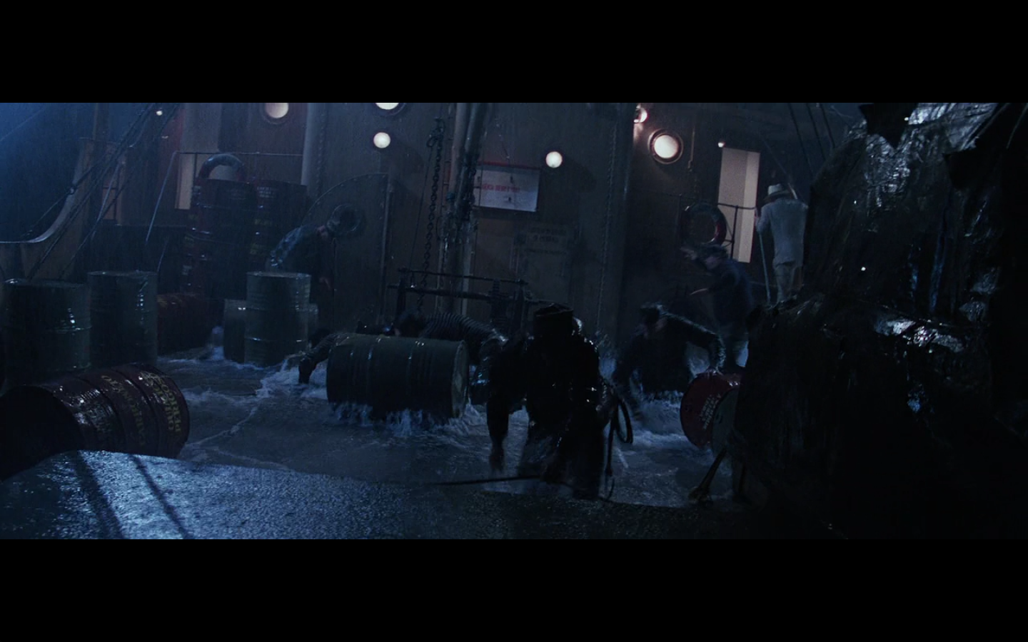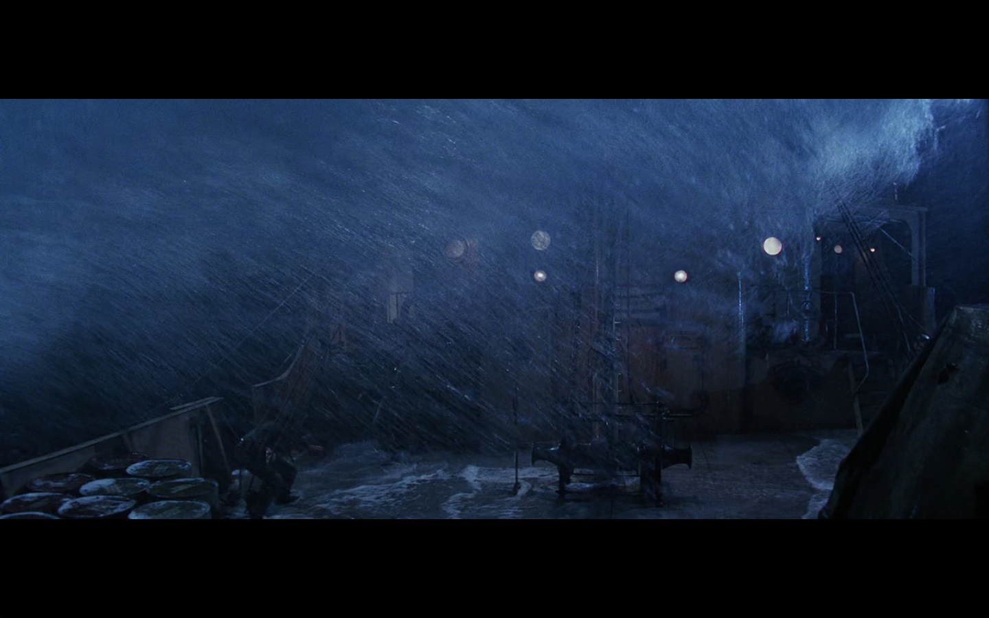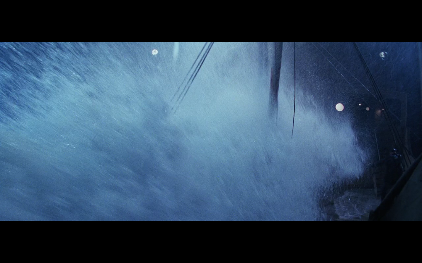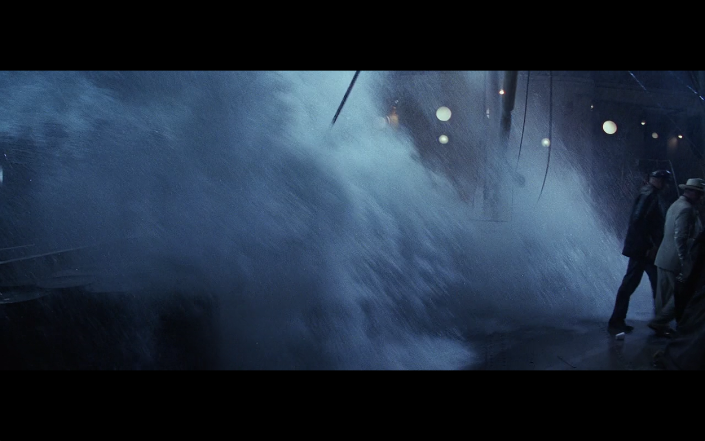 Telling you right now, this is one of my favorite shots in the film. Boat, wide shot, pouring rain, clearly on a soundstage, rocking back and forth, giant simulated waves crashing down, BARRELS!