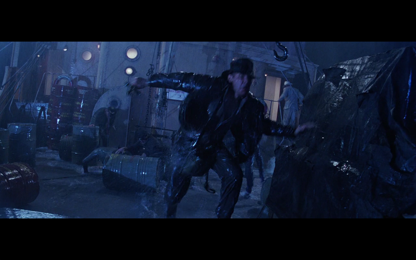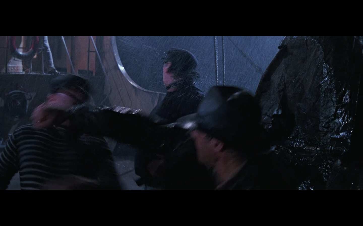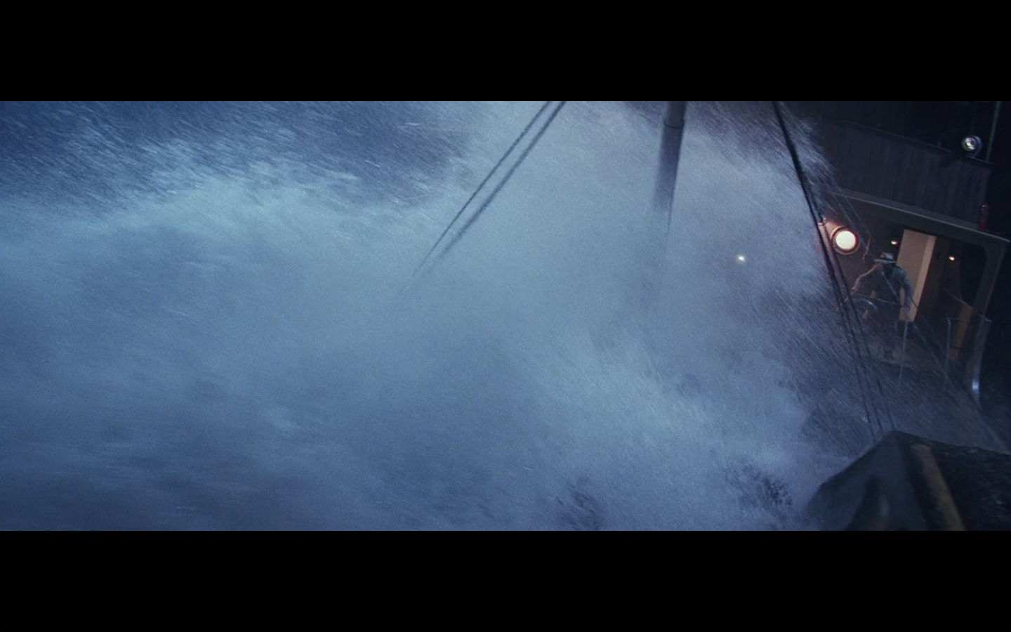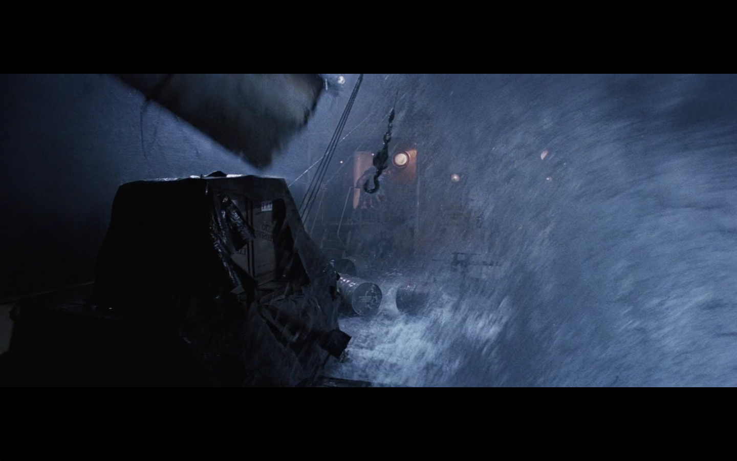 Telling you right now, this is one of my favorite shots in the film. Boat, wide shot, pouring rain, clearly on a soundstage, rocking back and forth, giant simulated waves crashing down, BARRELS!