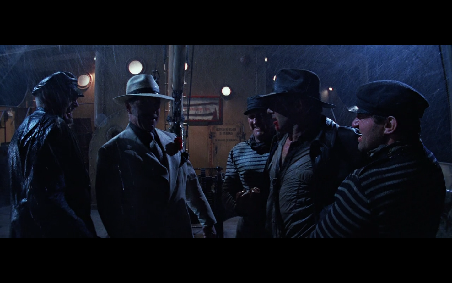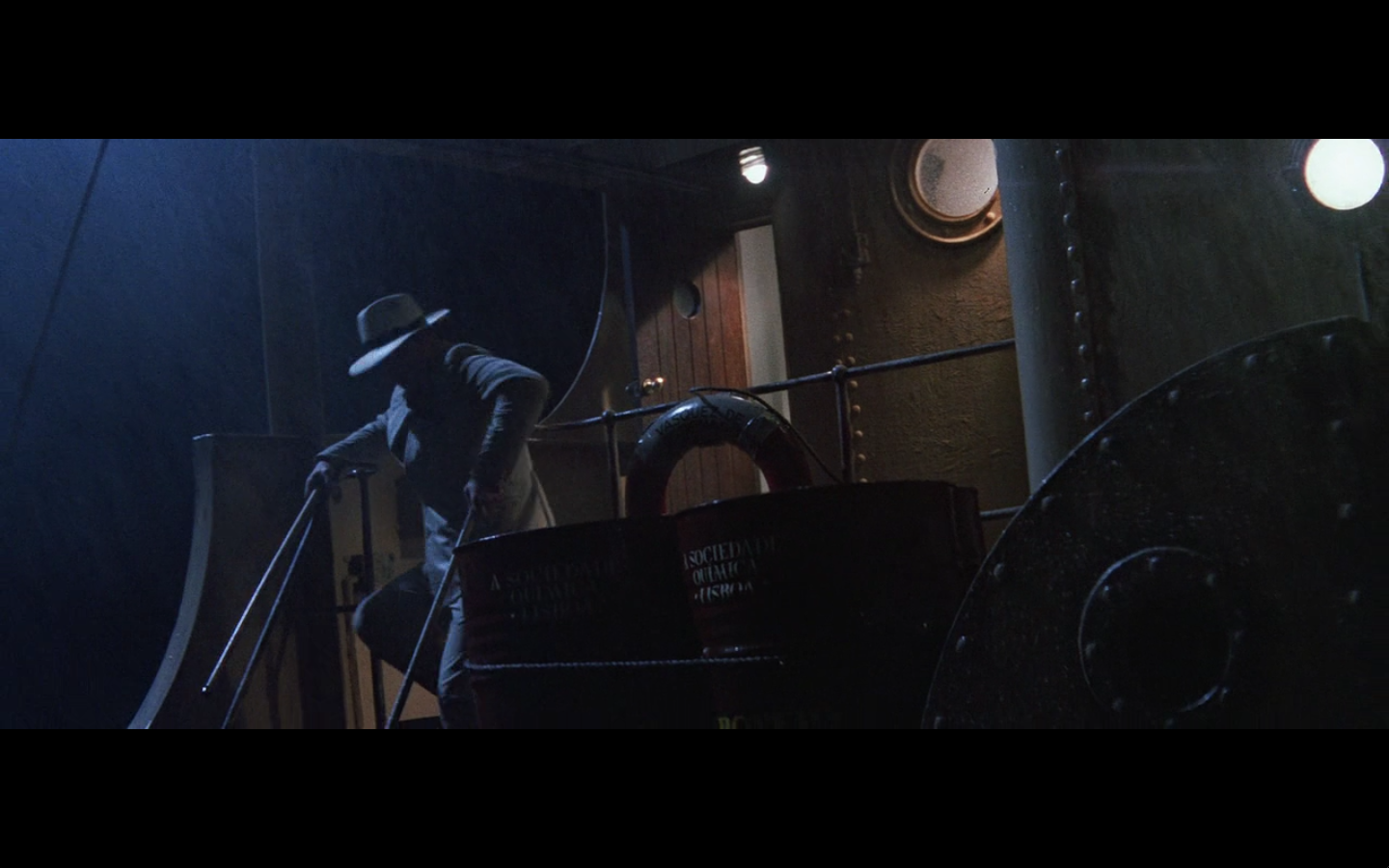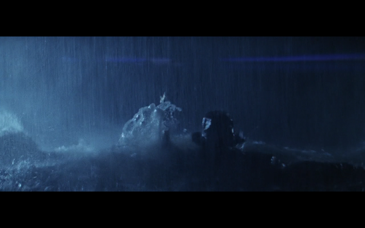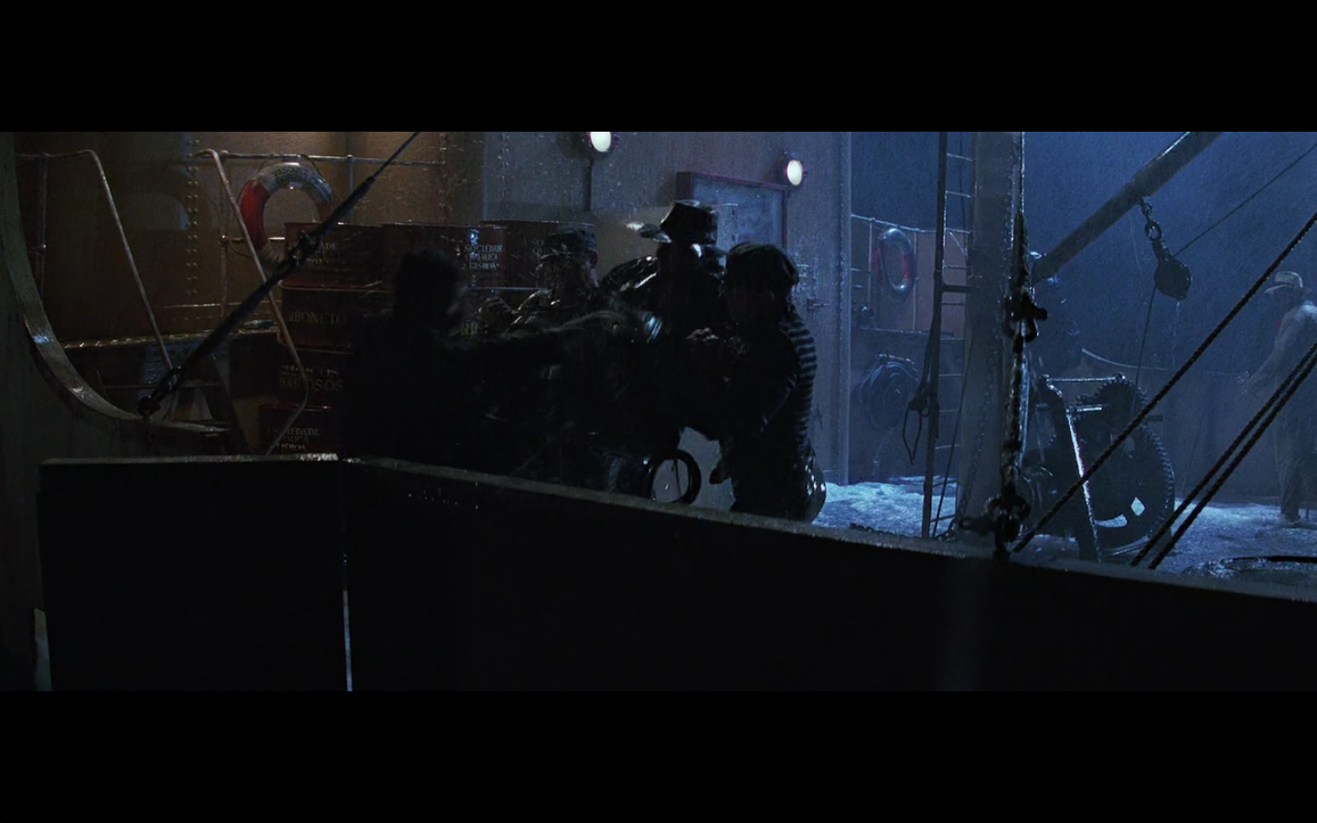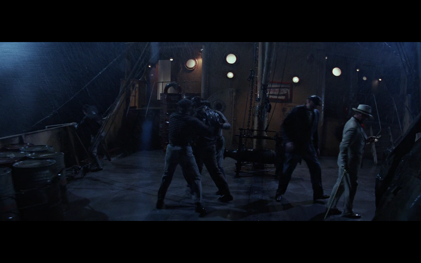 Telling you right now, this is one of my favorite shots in the film. Boat, wide shot, pouring rain, clearly on a soundstage, rocking back and forth, giant simulated waves crashing down, BARRELS!