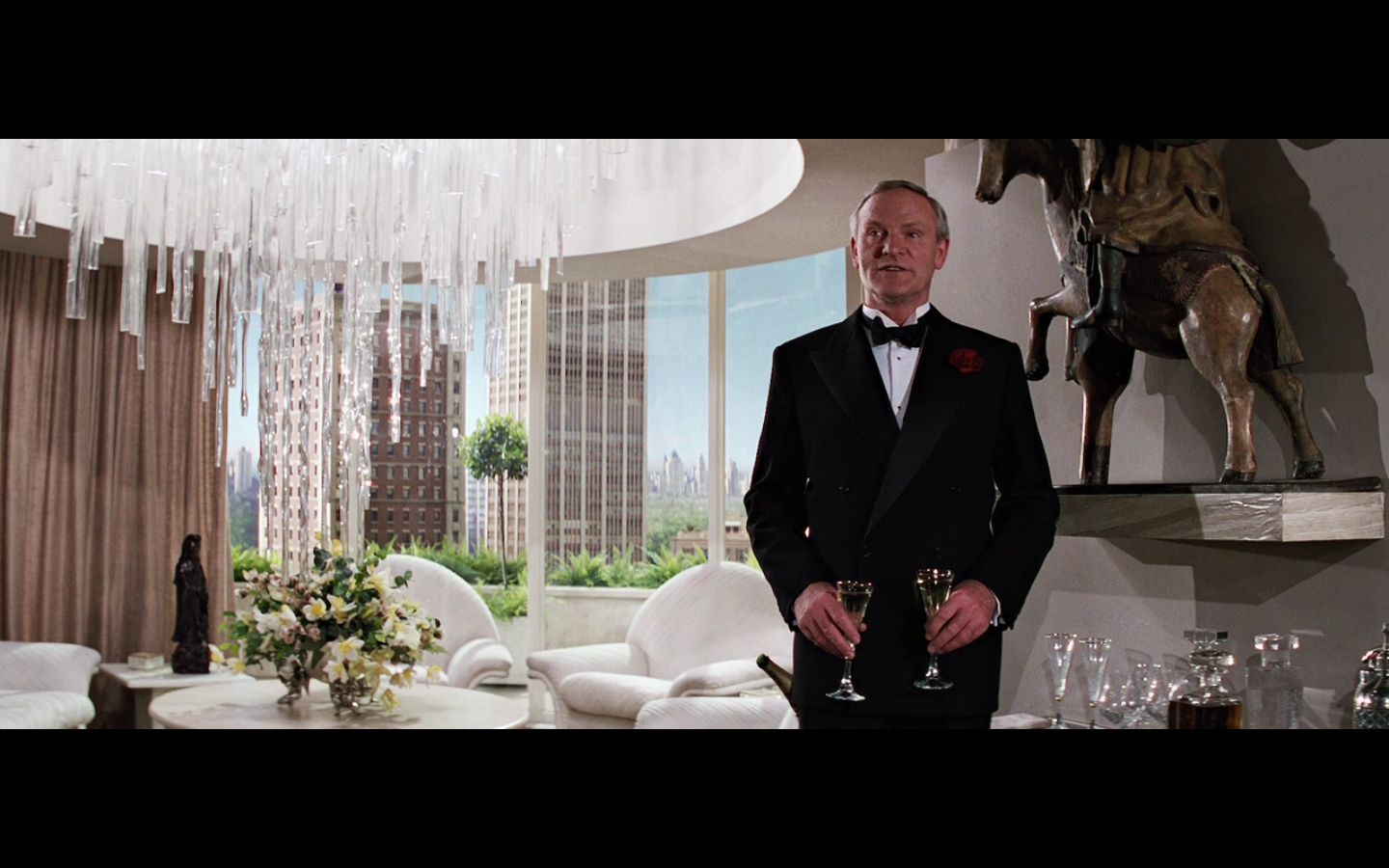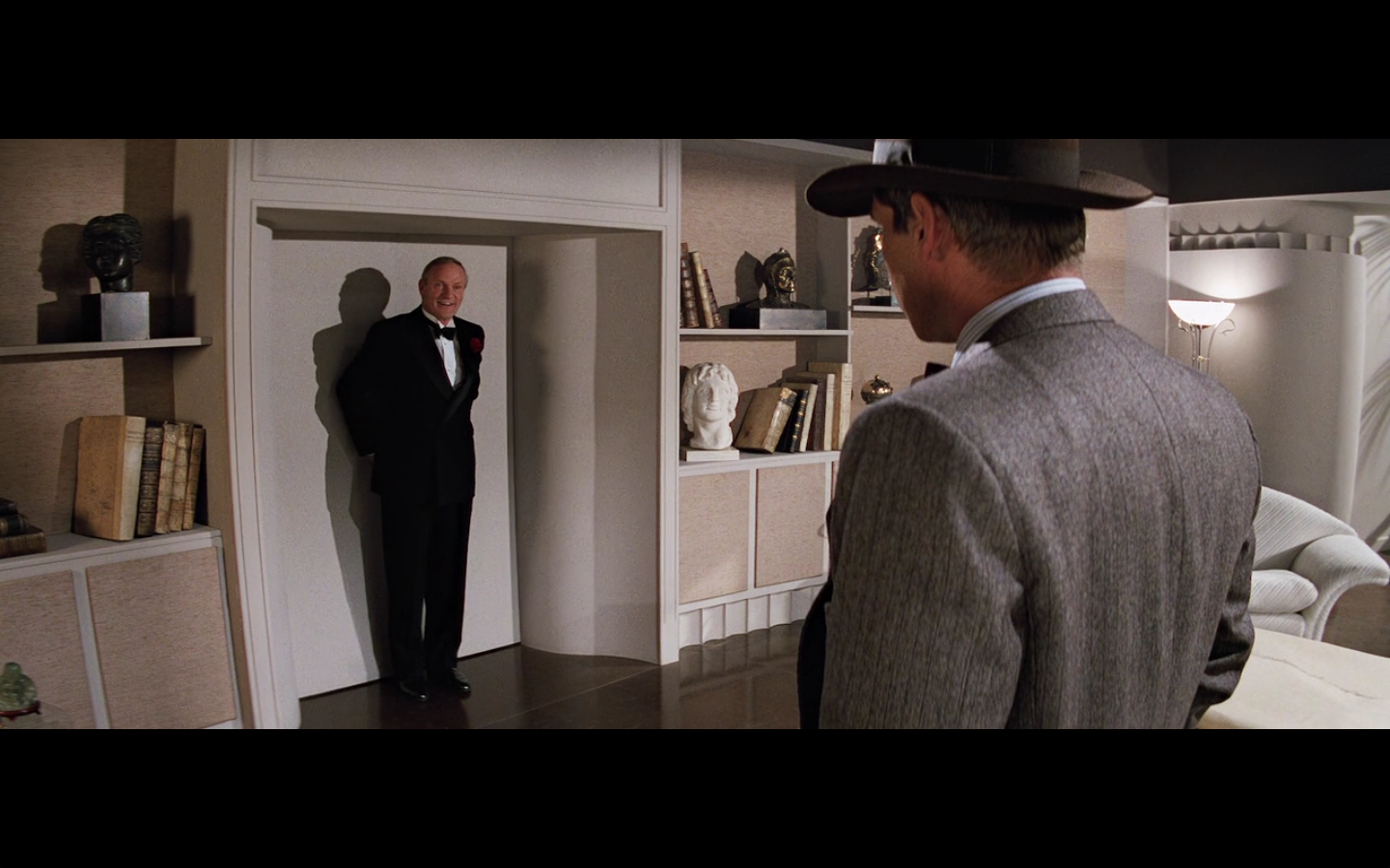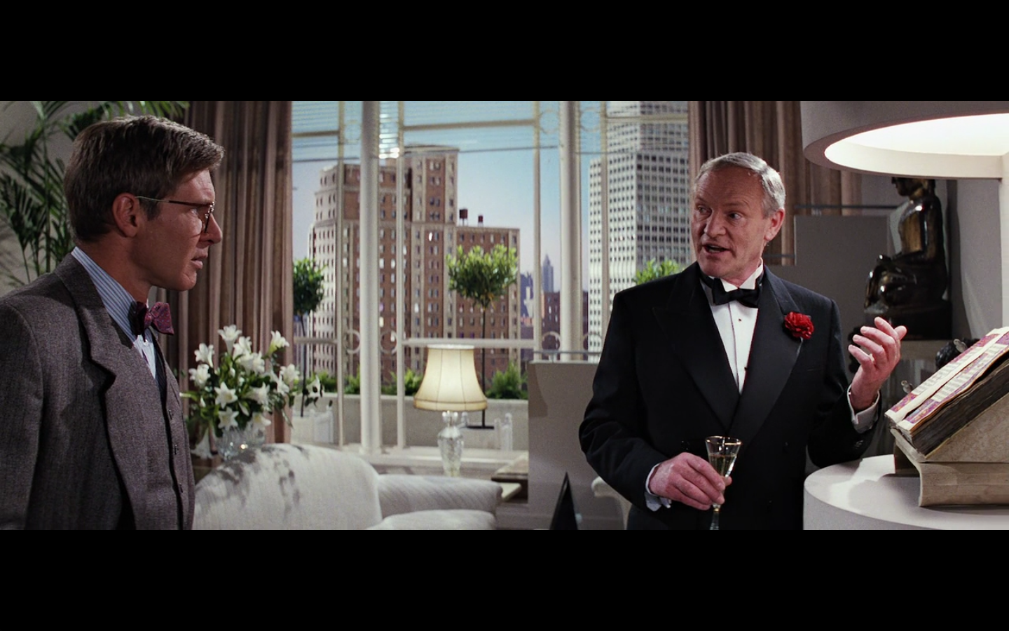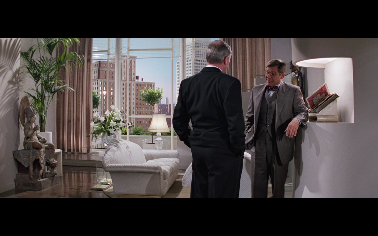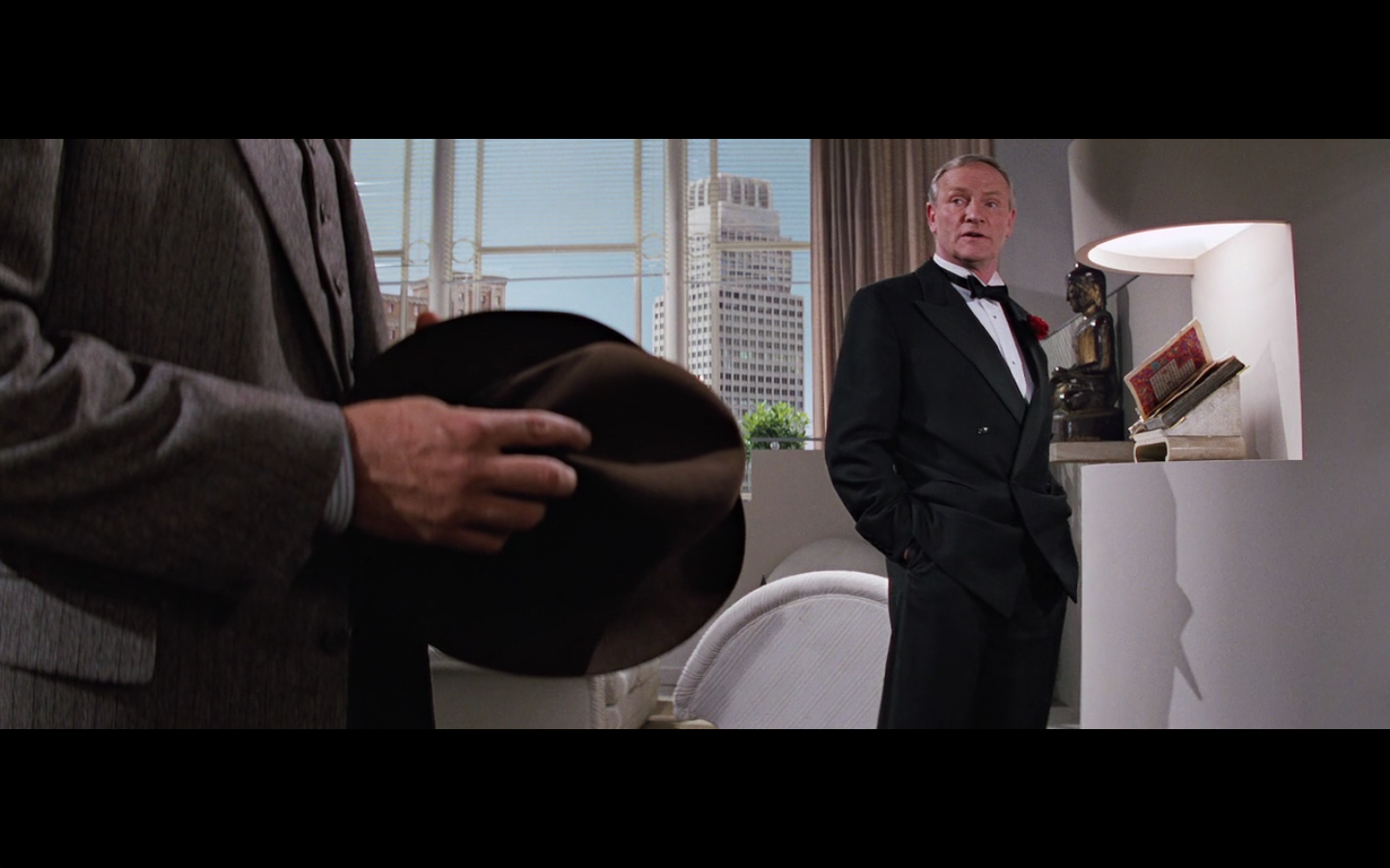 The thing I like about this is that they don’t tell you explicitly where this is. It’s clearly the city, based on the matte paintings out the windows. But it doesn’t matter for the story. He’s in a nice apartment where he doesn’t quite fit, and we’re going to get exposition. That’s the point. Today, you’d get a wide shot of the city and a title card telling you where we are. Don’t believe me? Wait two weeks.