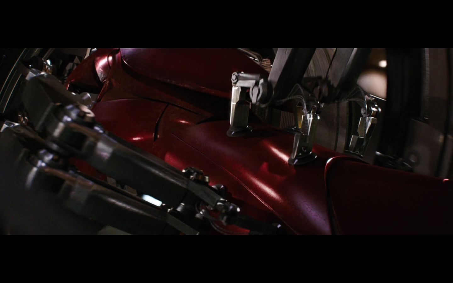 This all looks impressive, and then he gets rid of all of it later. Which is cool, because that’s how design works. The first iteration is almost never quite there, is it? And then later on, the thing just covers him like nothing. Shit, in the second movie, he has a suitcase that does it.