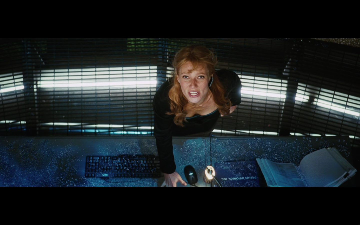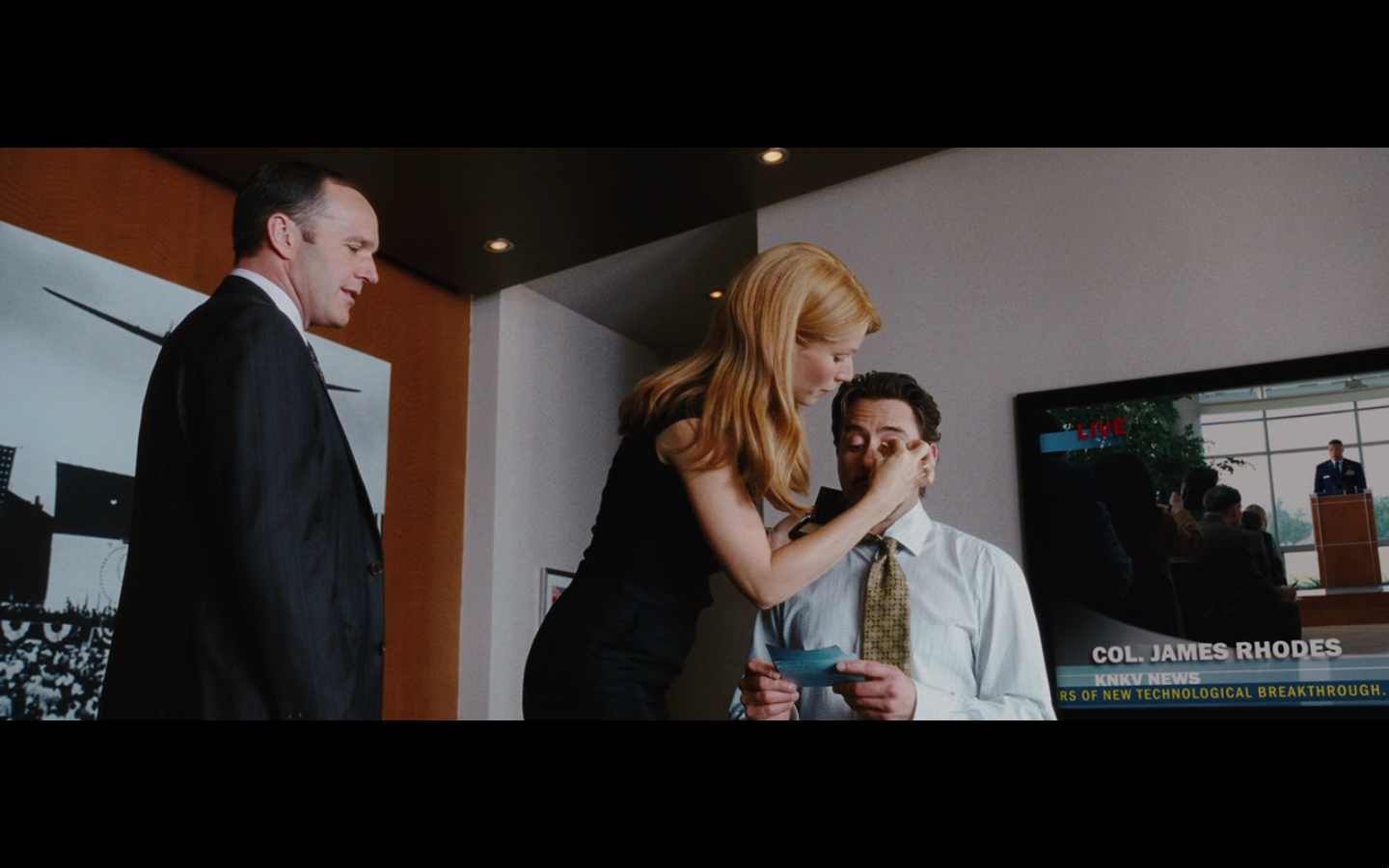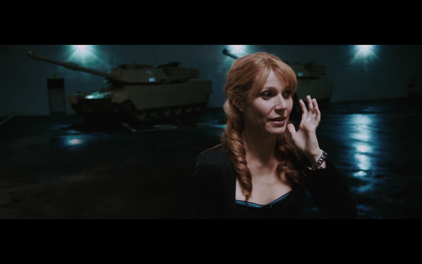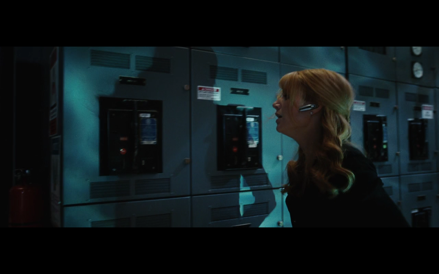See this shot? Pepper’s not saying anything, is she? Not even making a gesture like she’s speaking into a phone, is she? Here’s the dialogue from this moment: