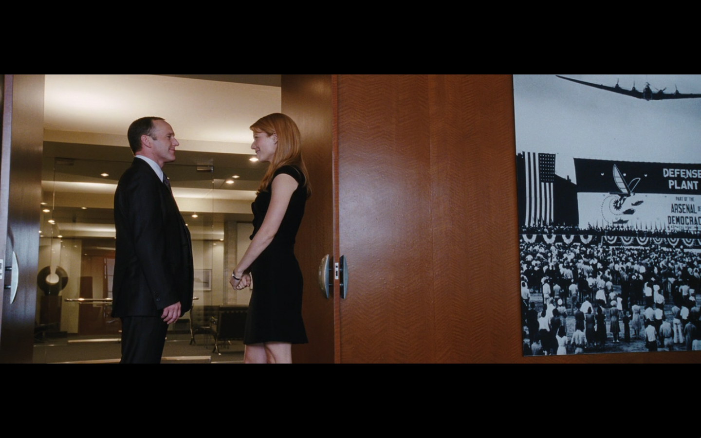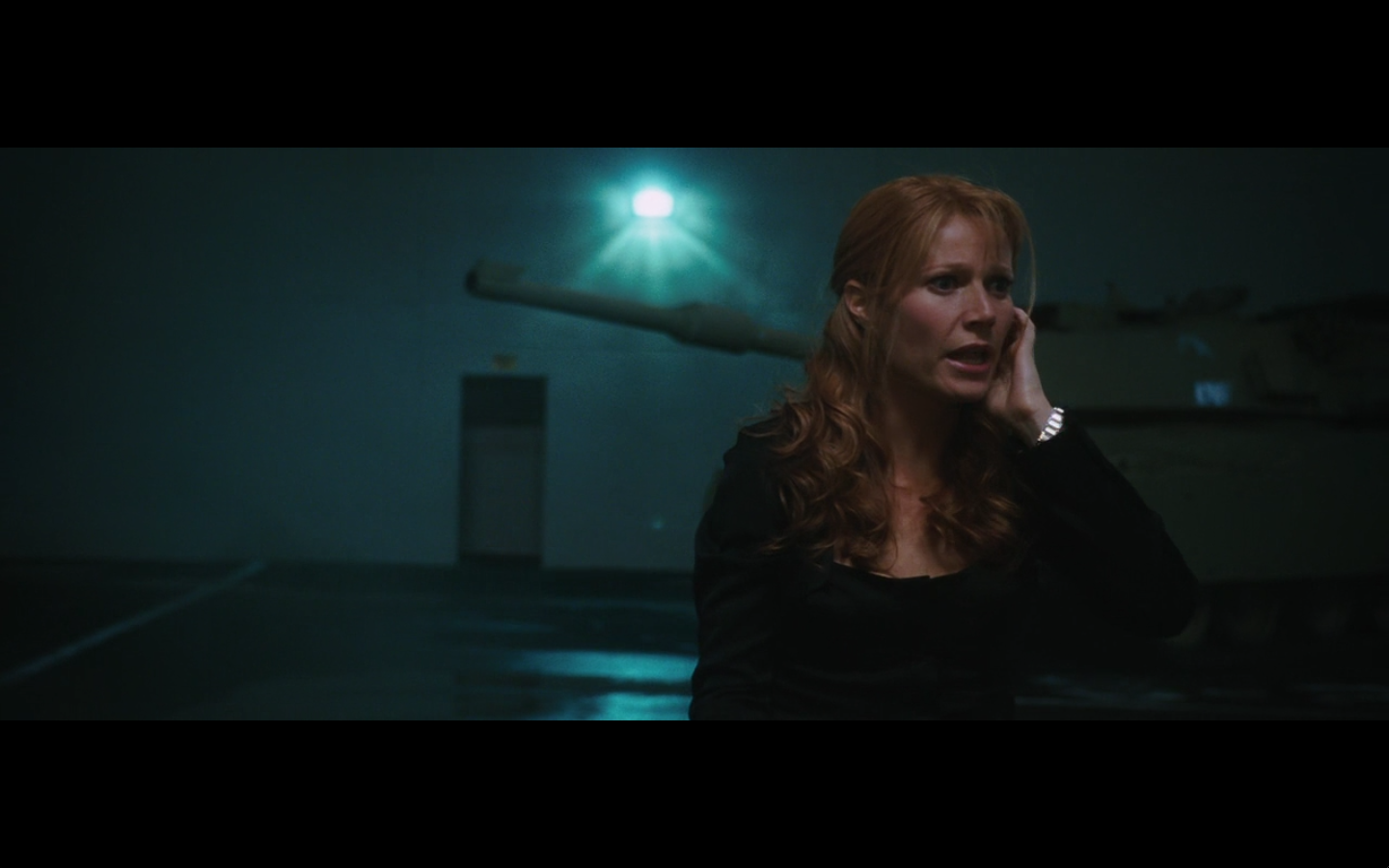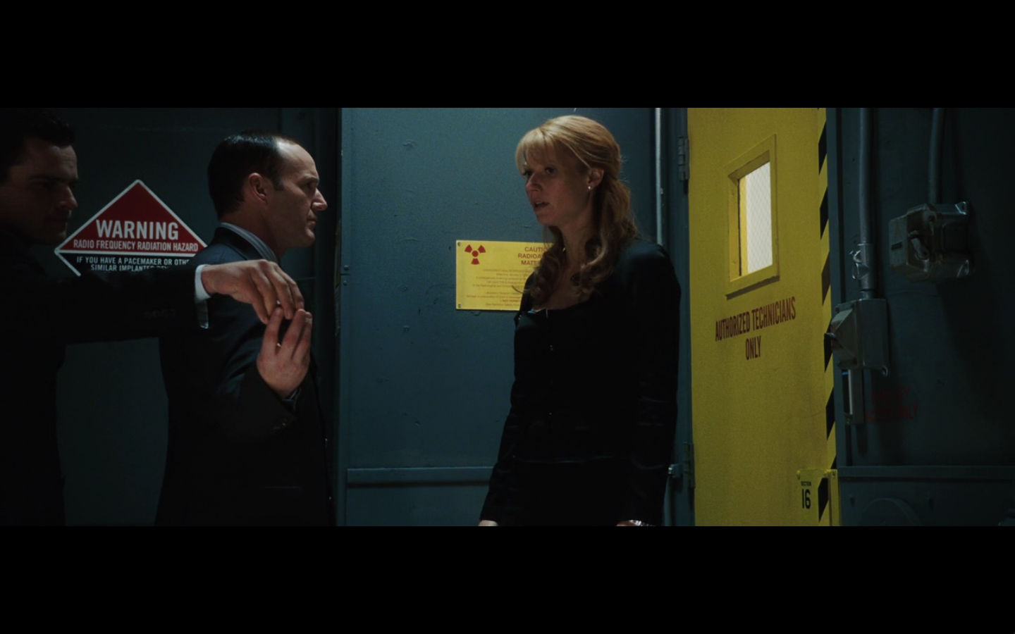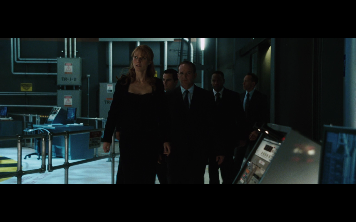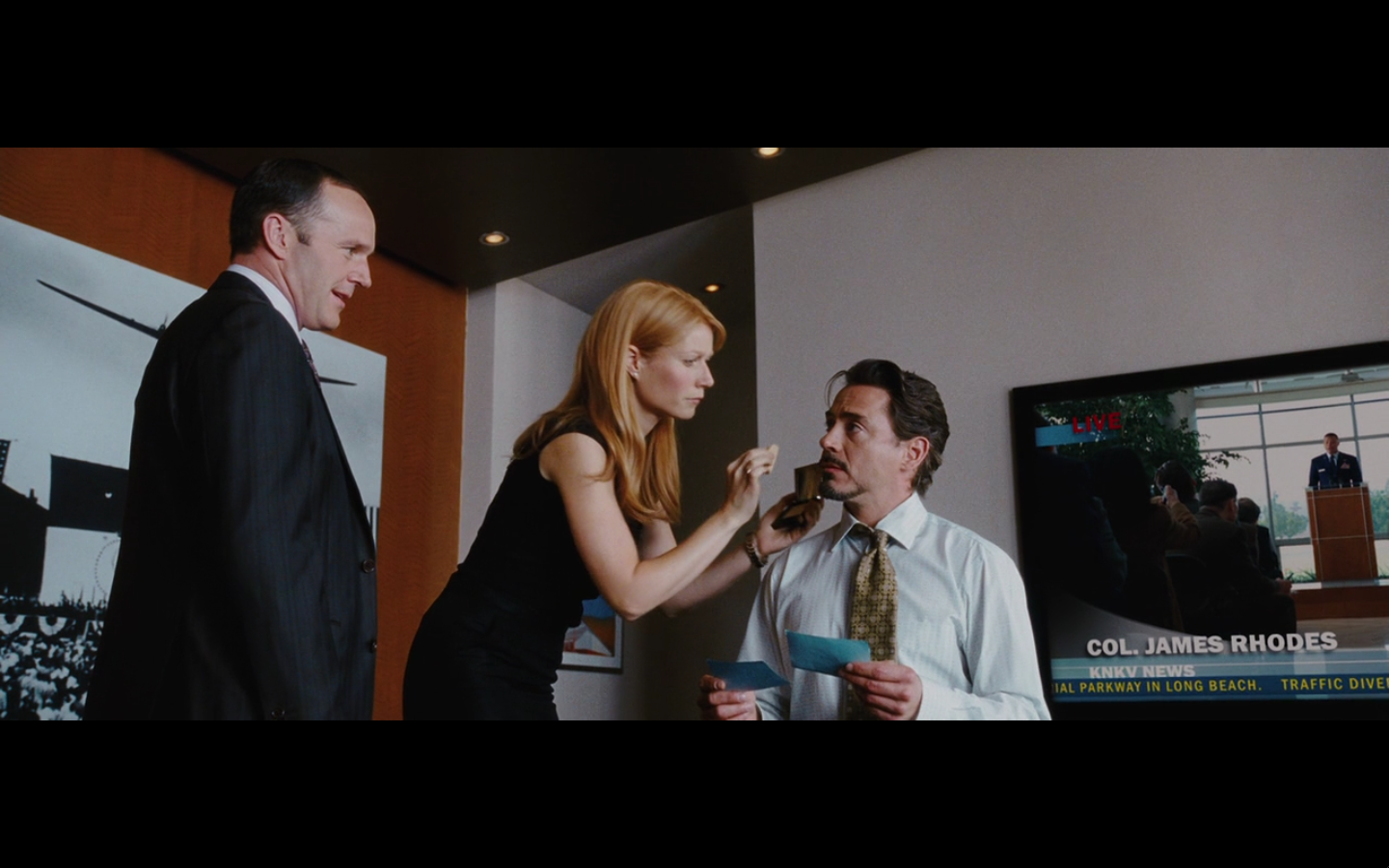 See this shot? Pepper’s not saying anything, is she? Not even making a gesture like she’s speaking into a phone, is she? Here’s the dialogue from this moment: