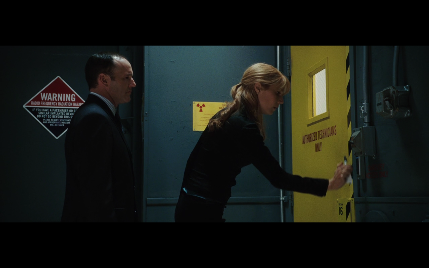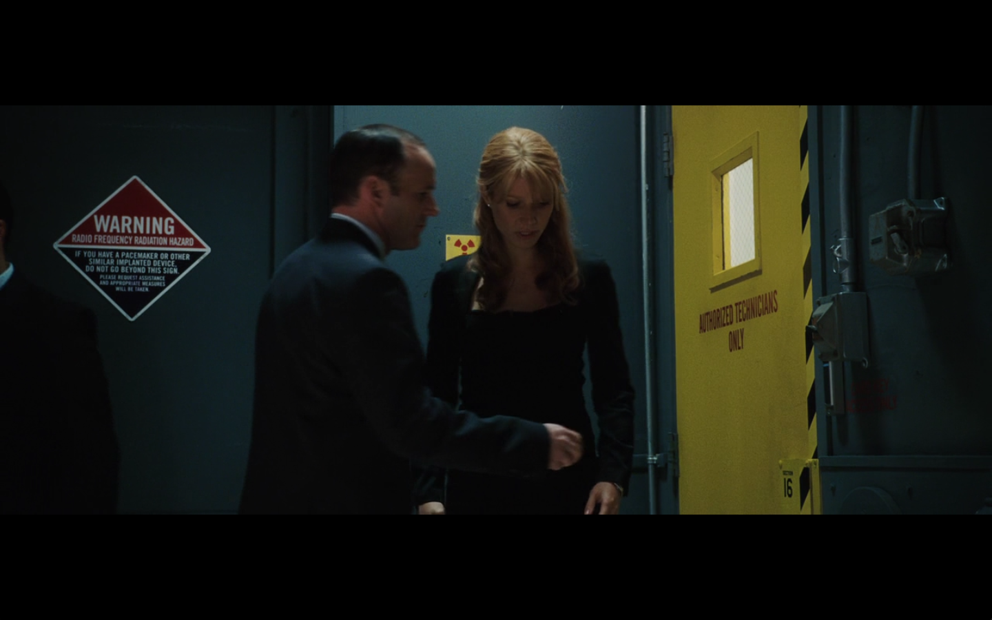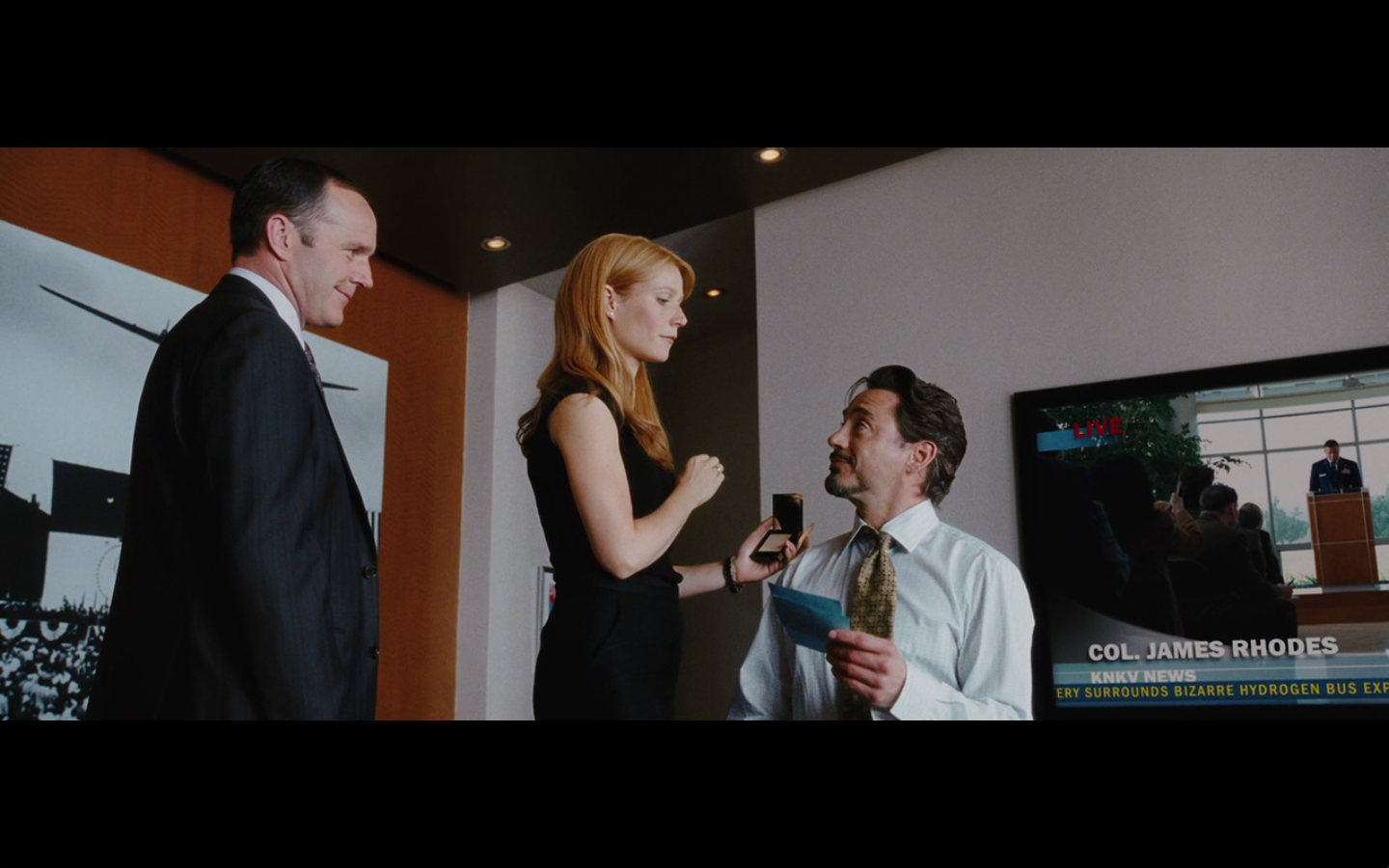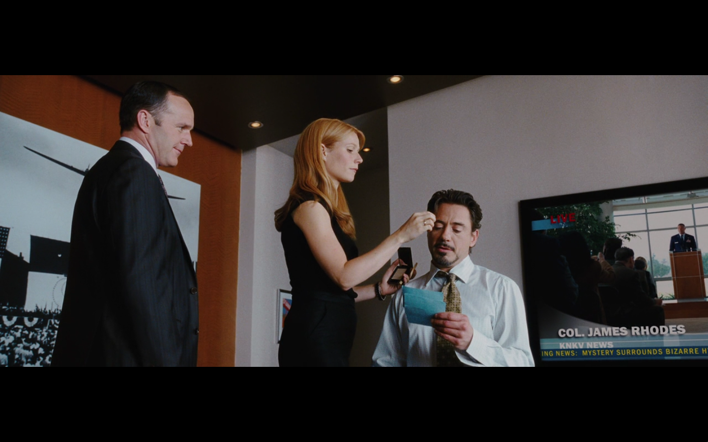 See this shot? Pepper’s not saying anything, is she? Not even making a gesture like she’s speaking into a phone, is she? Here’s the dialogue from this moment: