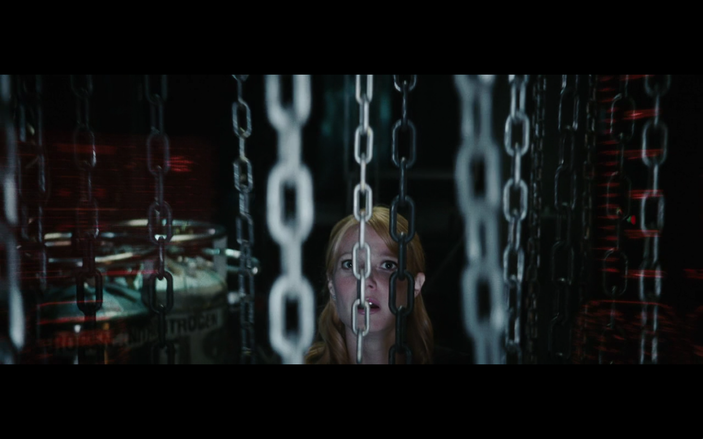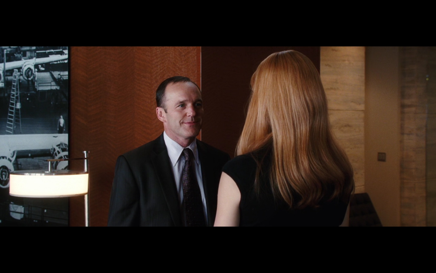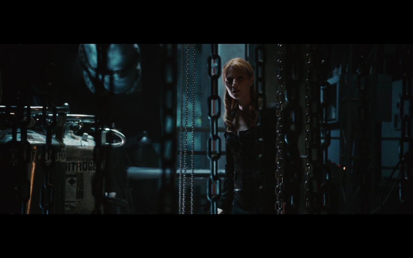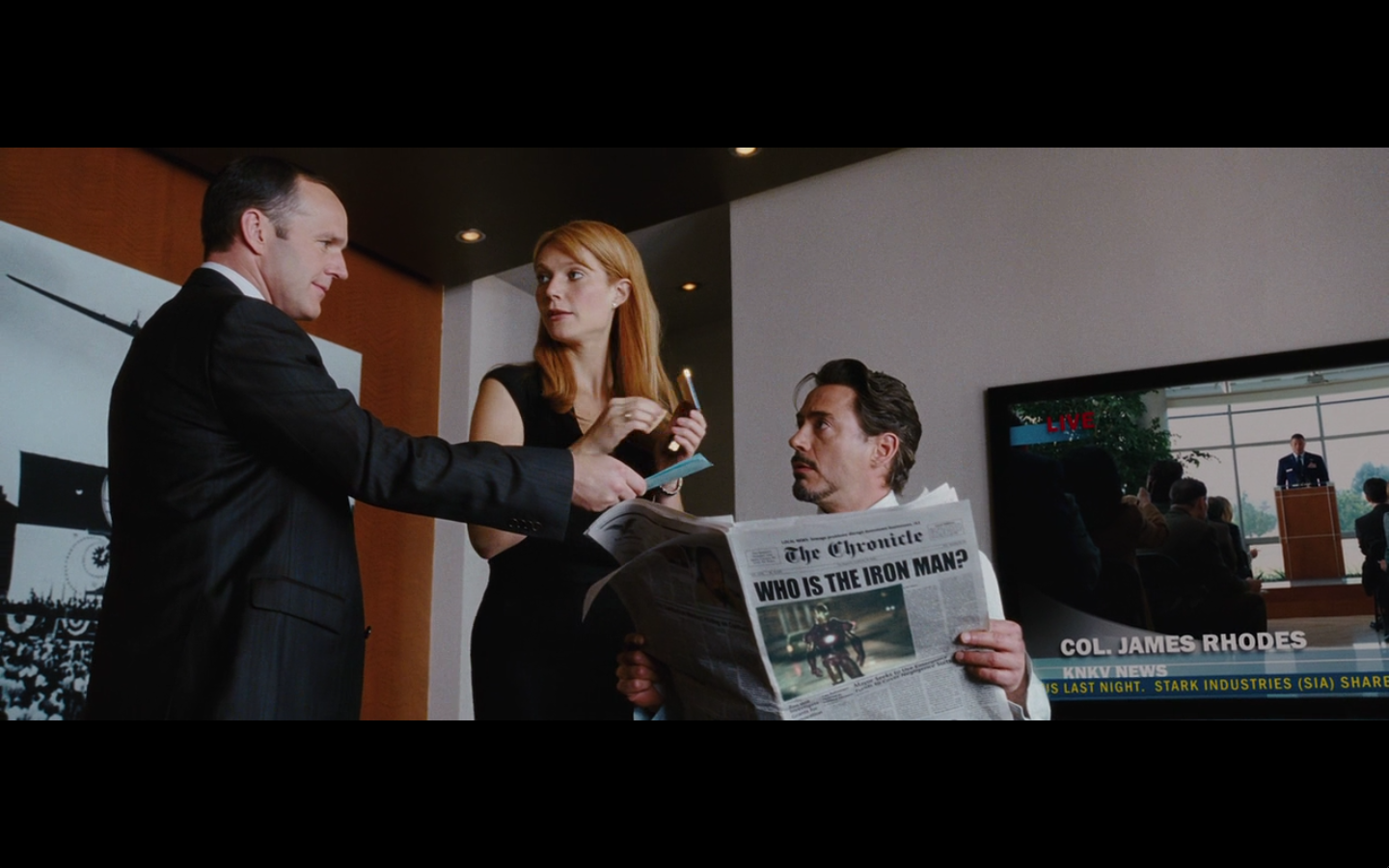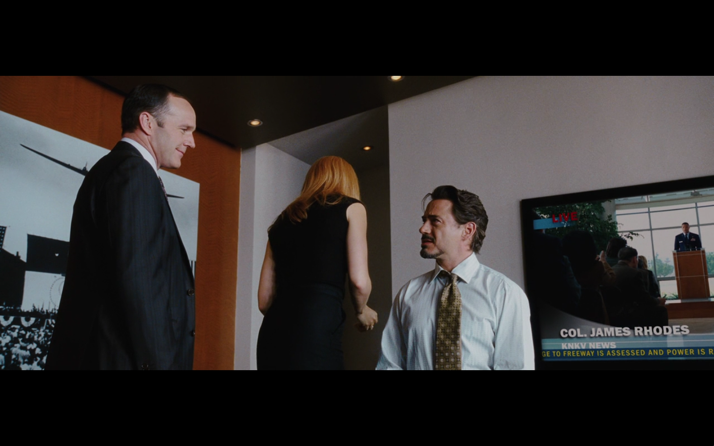 See this shot? Pepper’s not saying anything, is she? Not even making a gesture like she’s speaking into a phone, is she? Here’s the dialogue from this moment: