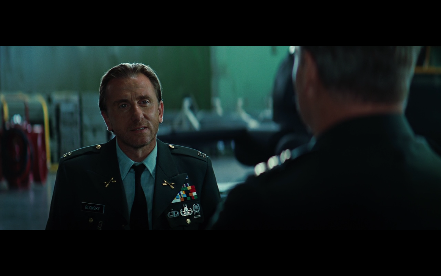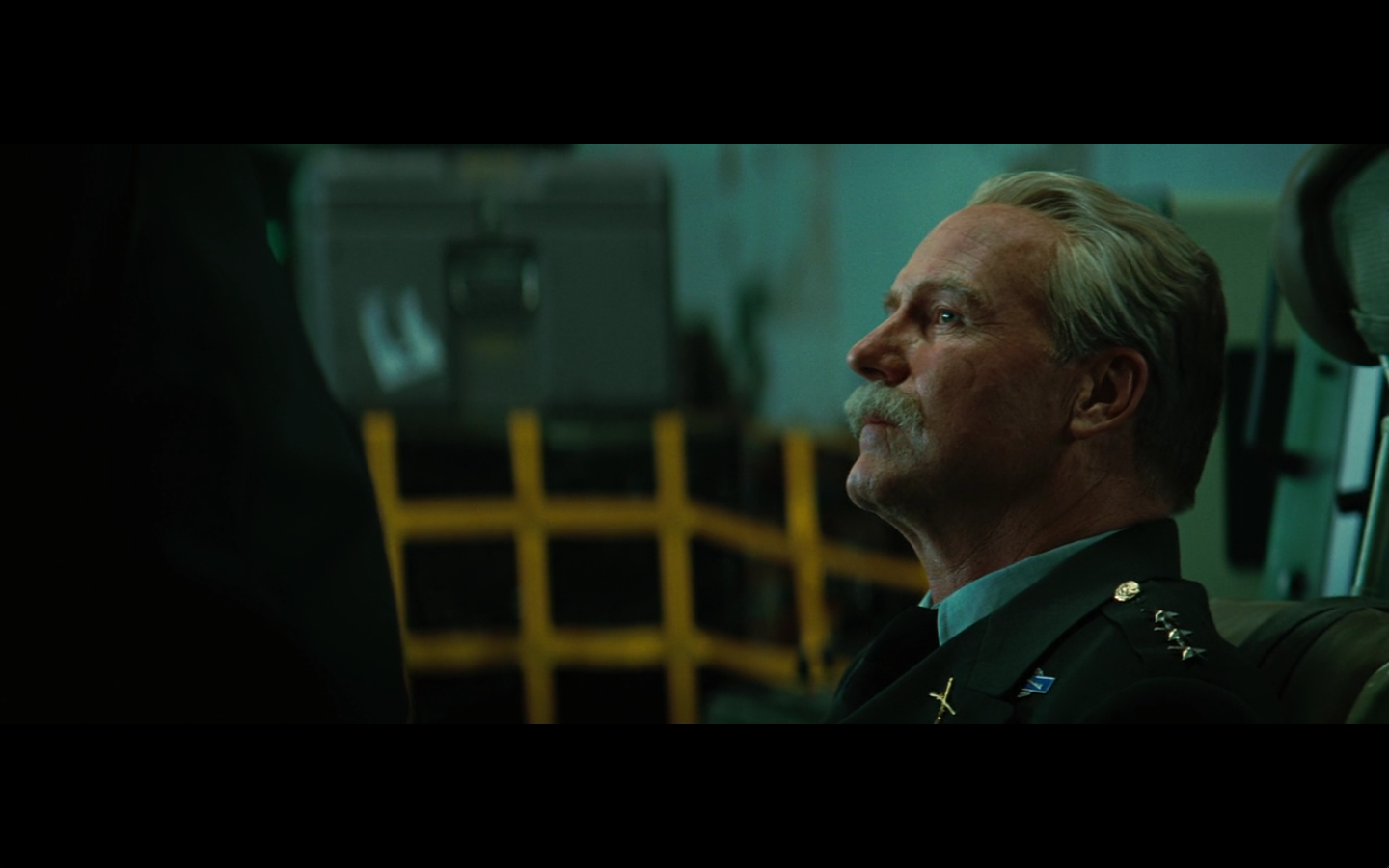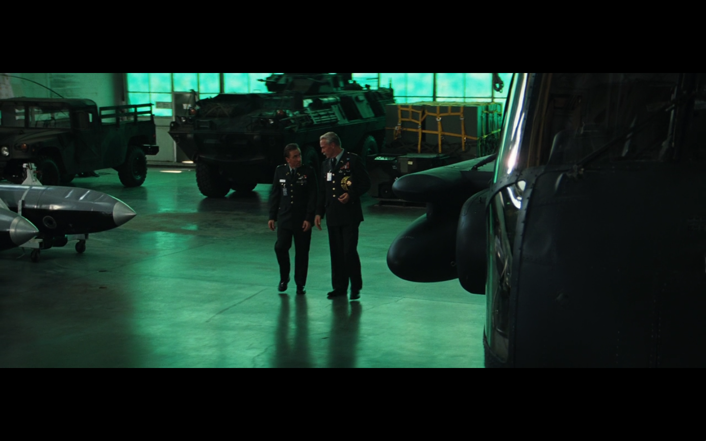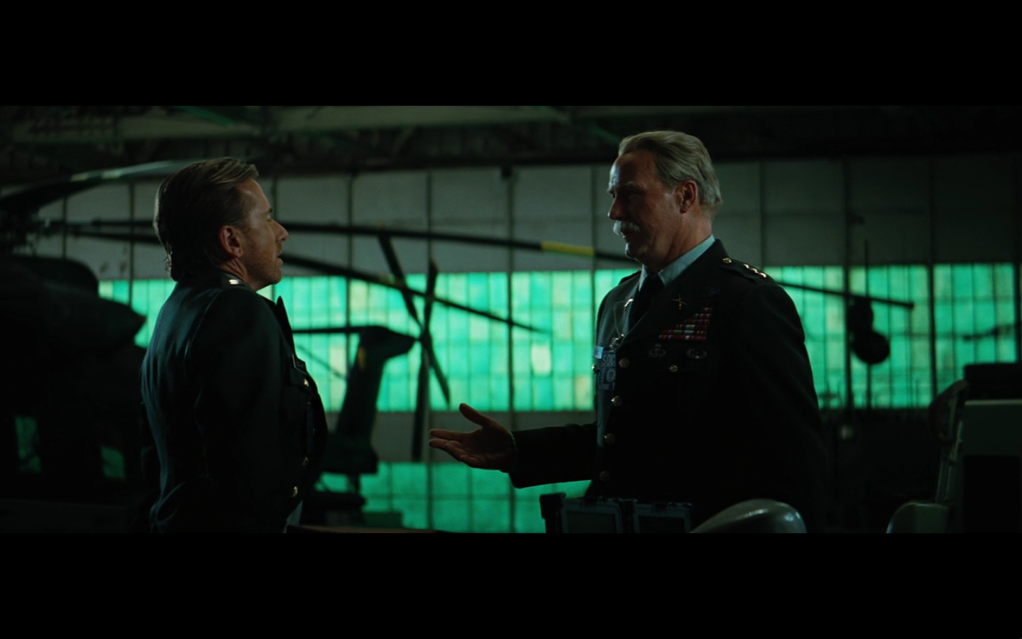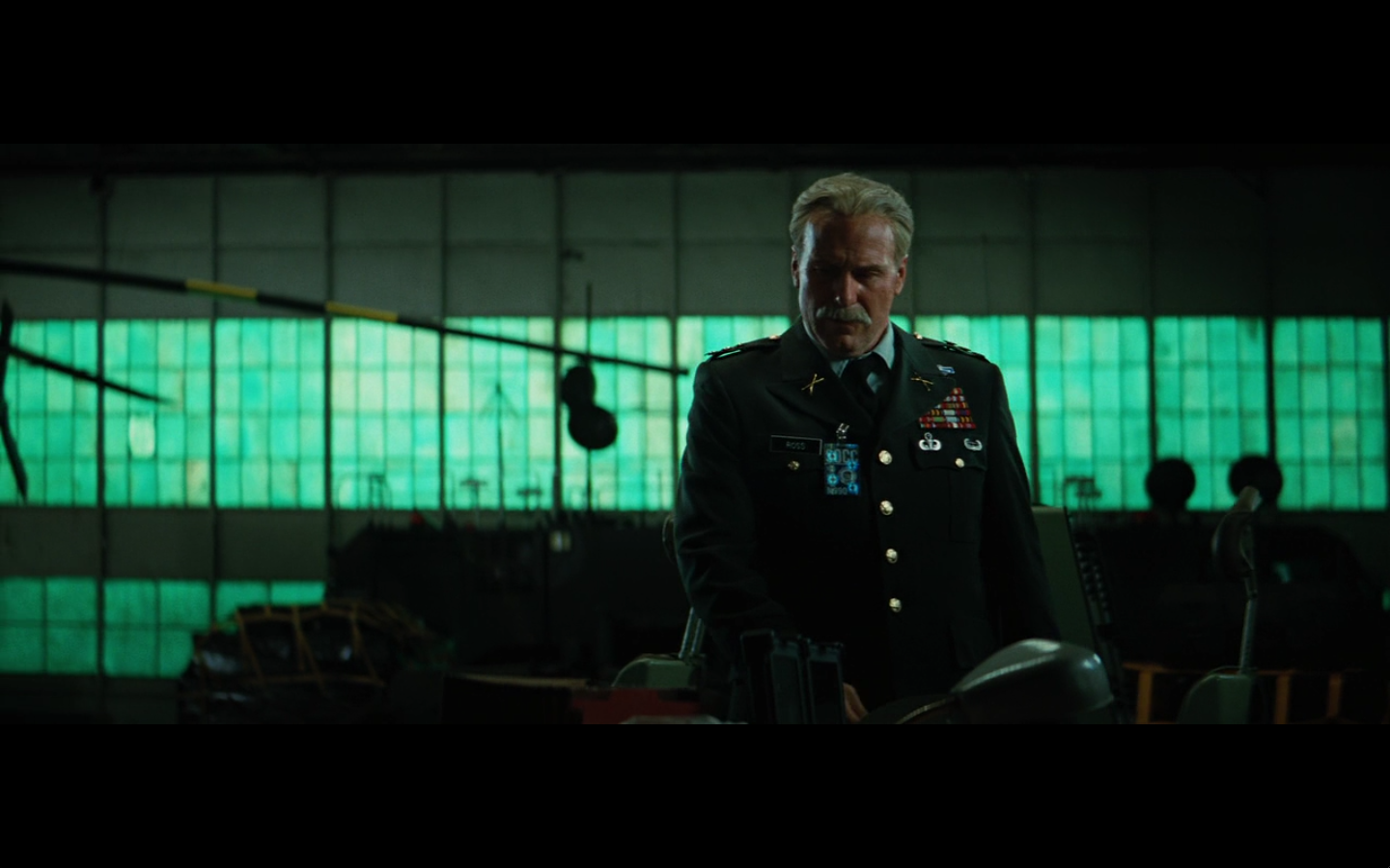 I’d also like to stop for a second to point out the shots. Where this is being done. They had to do this in this dimly-lit hangar, which is inexplicably green, with a helicopter. So we have military stuff, and GREEN. Cause…I dunno, Hulk? They really tried to go full comic book with this one, and it doesn’t work.