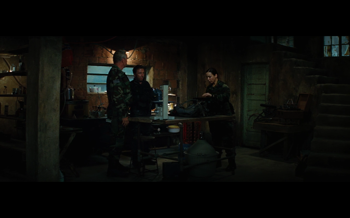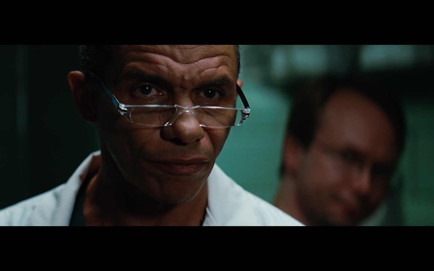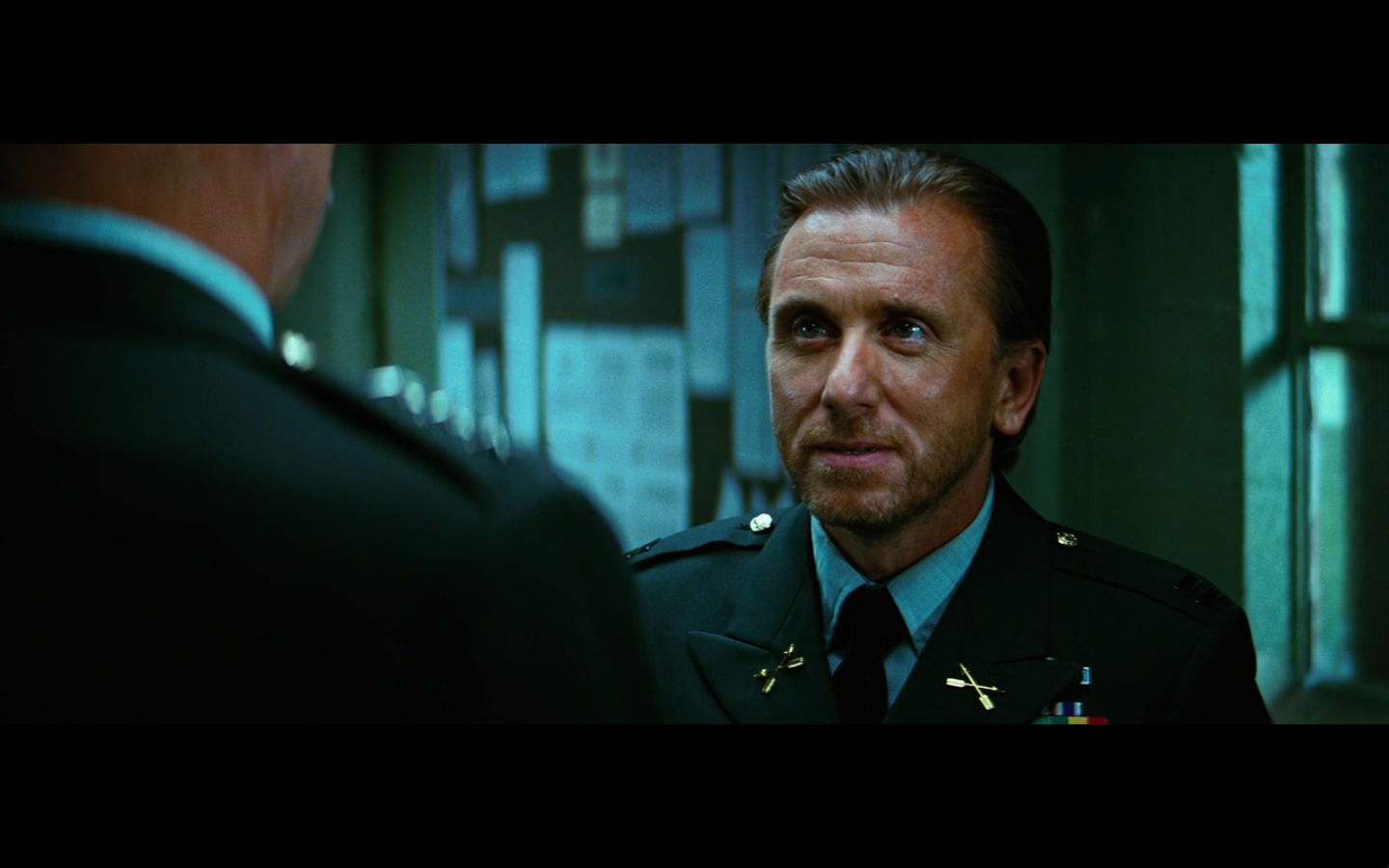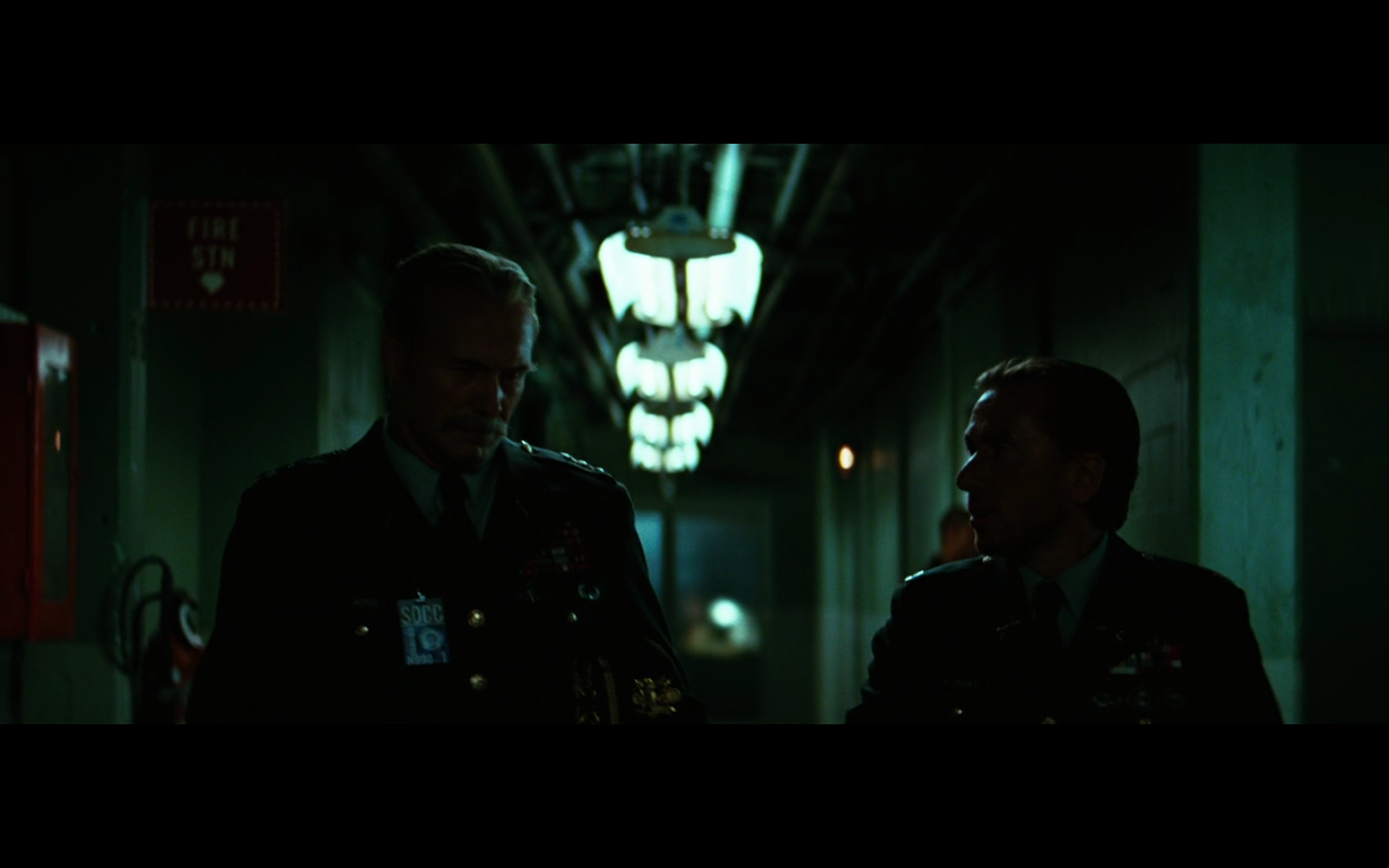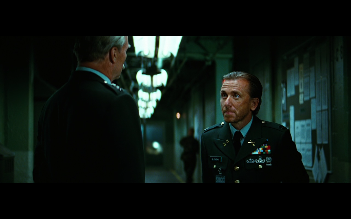 I’d also like to stop for a second to point out the shots. Where this is being done. They had to do this in this dimly-lit hangar, which is inexplicably green, with a helicopter. So we have military stuff, and GREEN. Cause…I dunno, Hulk? They really tried to go full comic book with this one, and it doesn’t work.