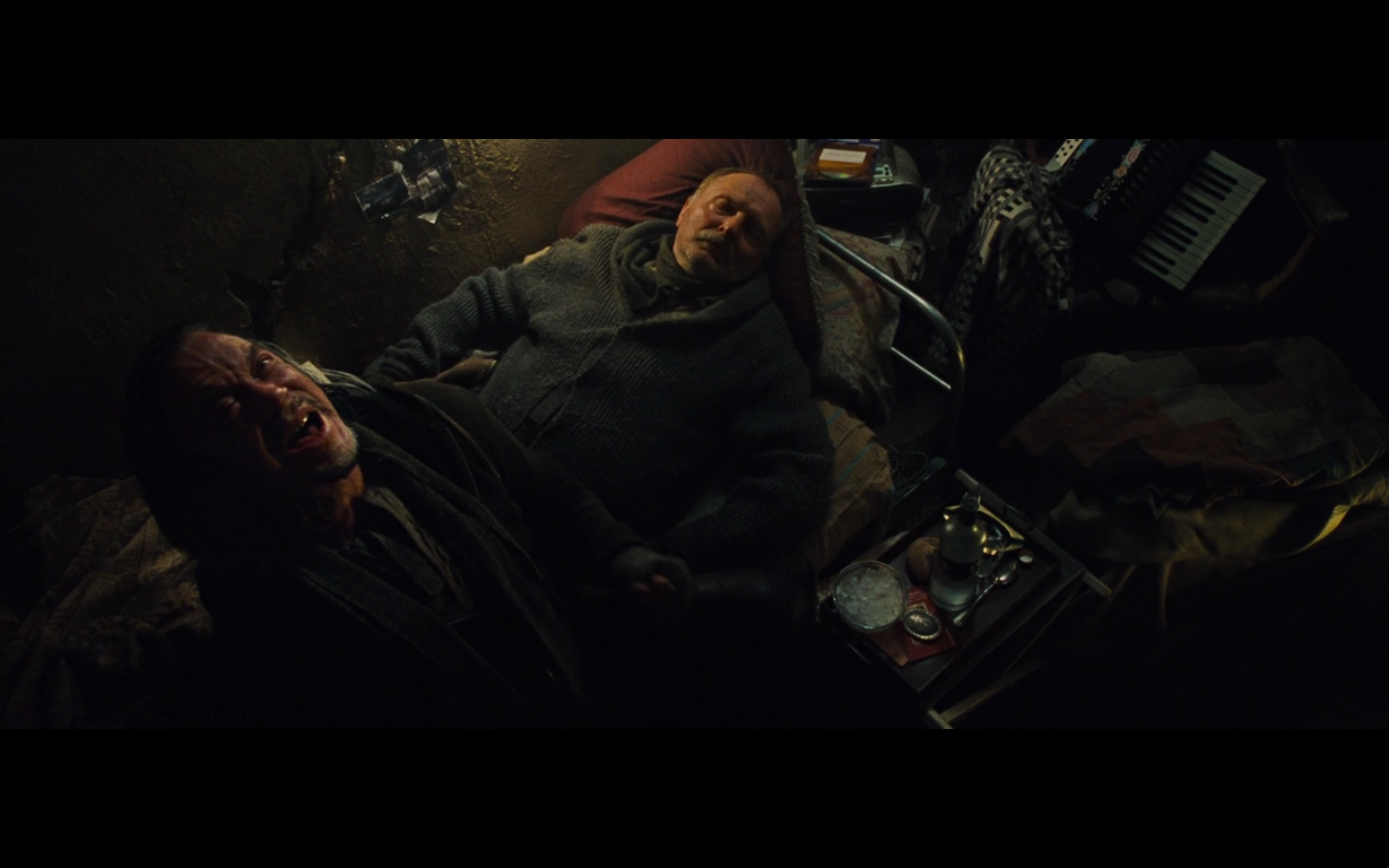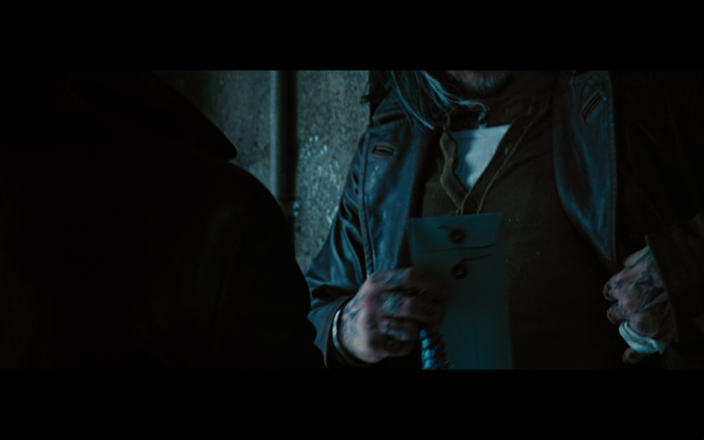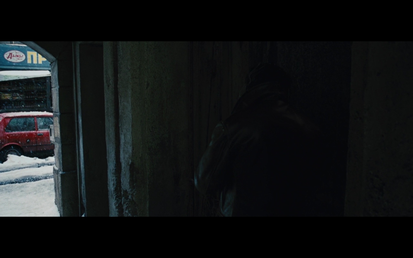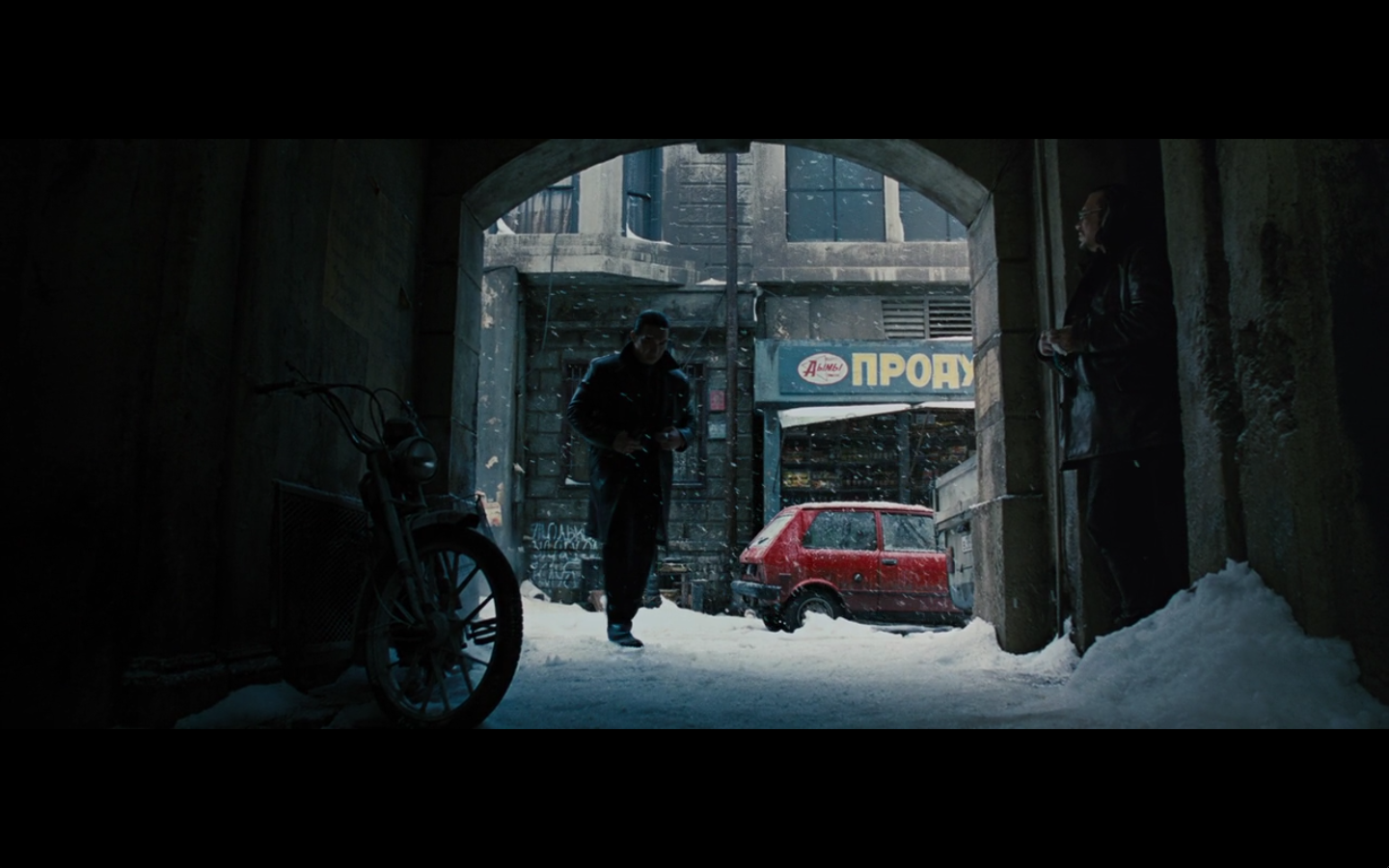 They meet in the alley outside his apartment and try to look suspicious as poor people walk past them on the way to the snow farms or whatever. We get it, Russia. You’re poor and shifty.