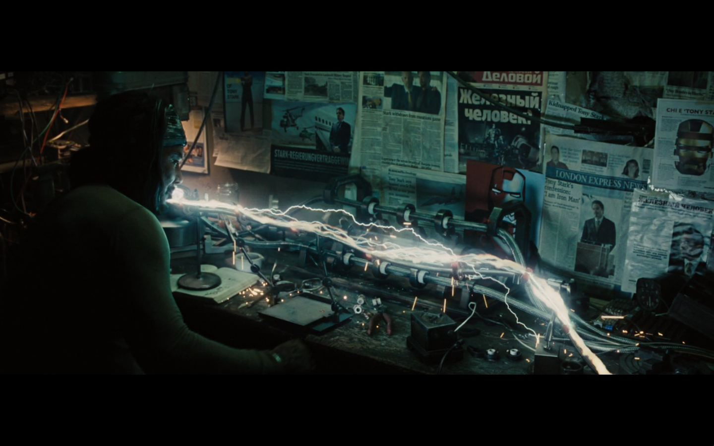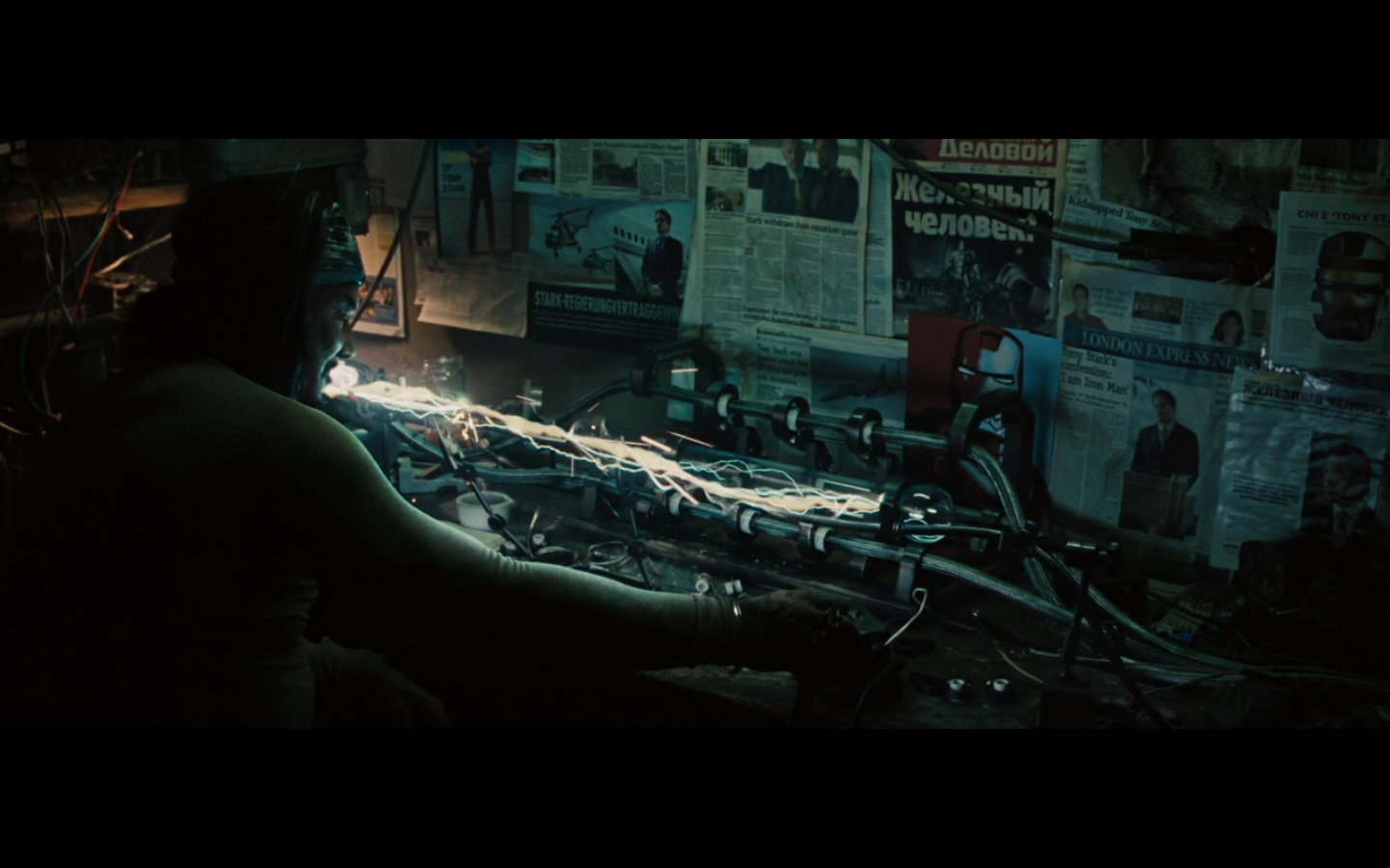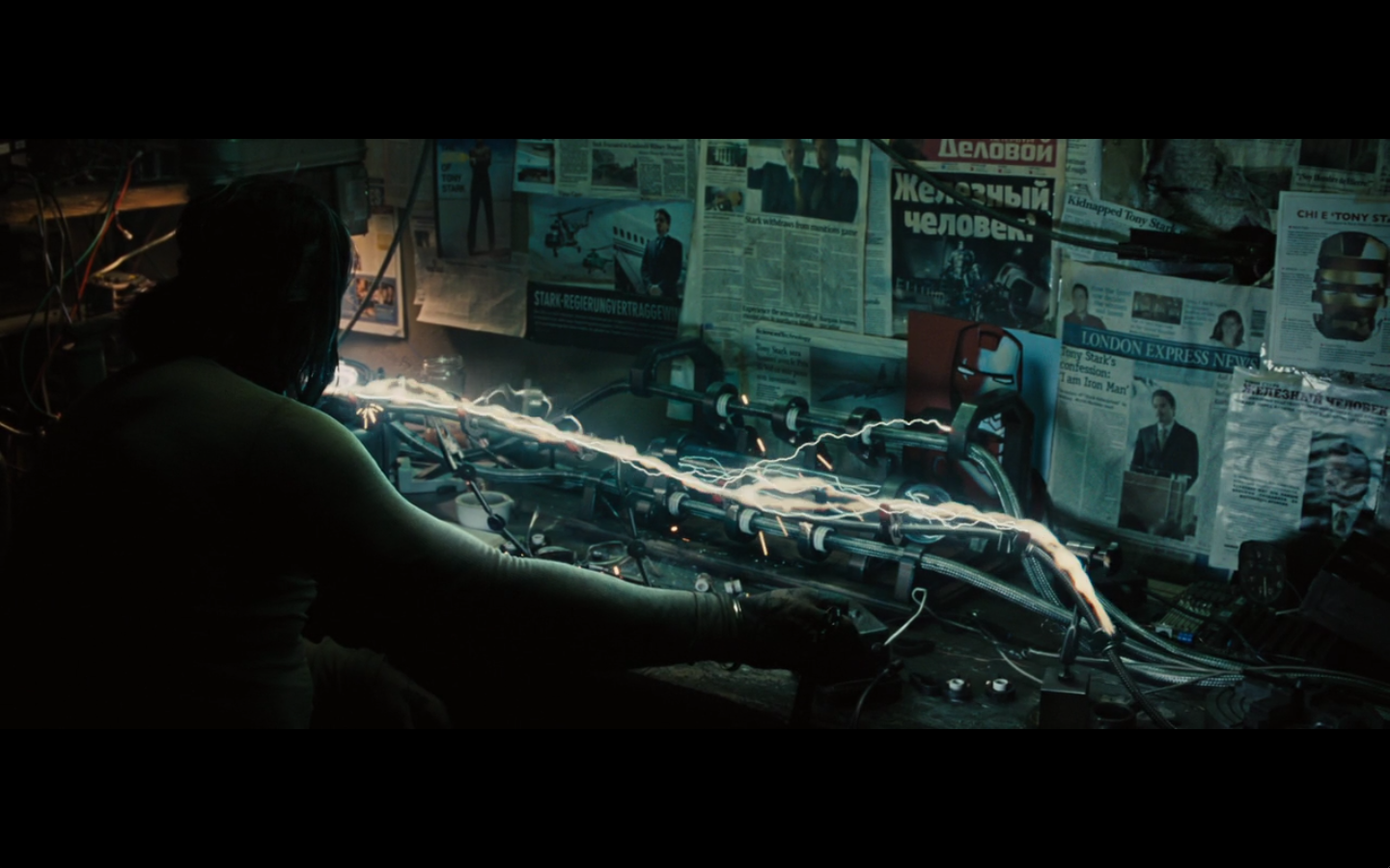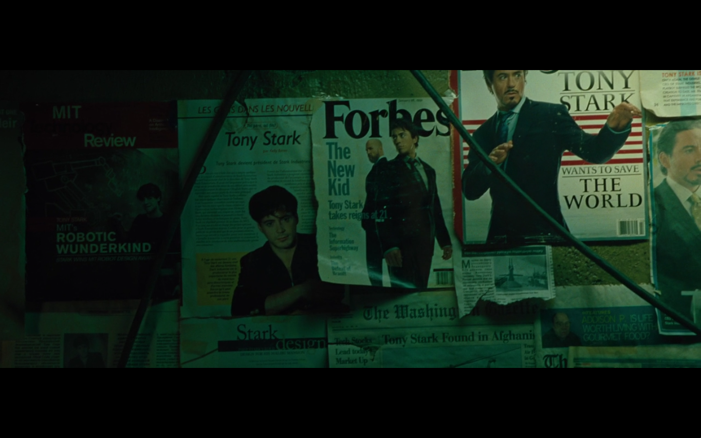 He’s going all John Nash with the pictures and push pins and all that. Did he buy an English copy of Forbes and one from Rolling Stone? Also, the one on the right is from after he became Iron Man, so are we to assume that somewhere in this montage of creating his own arc reactor, he went out and bought a newspaper so he could cut it out and put it up on the bulletin board and look at it? I never understood stuff like this. It’s all intentional, cause you know they have to make all these clippings specially for the film.