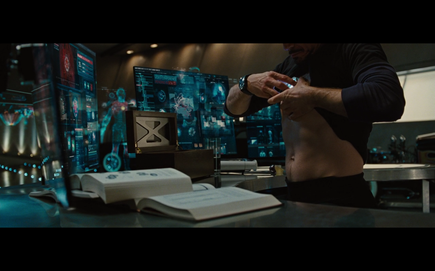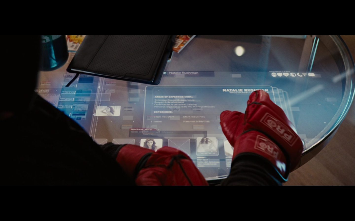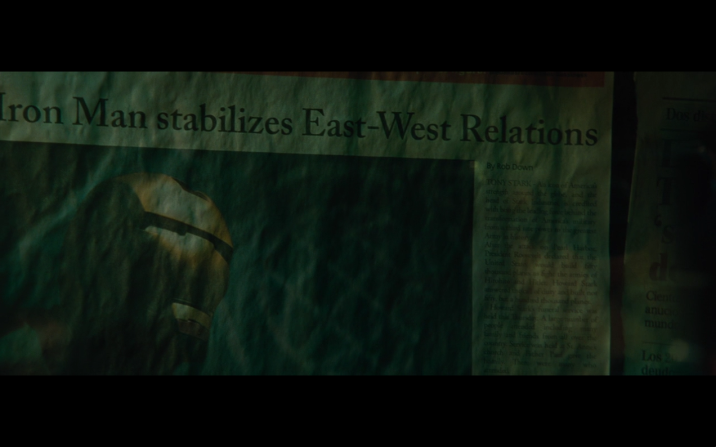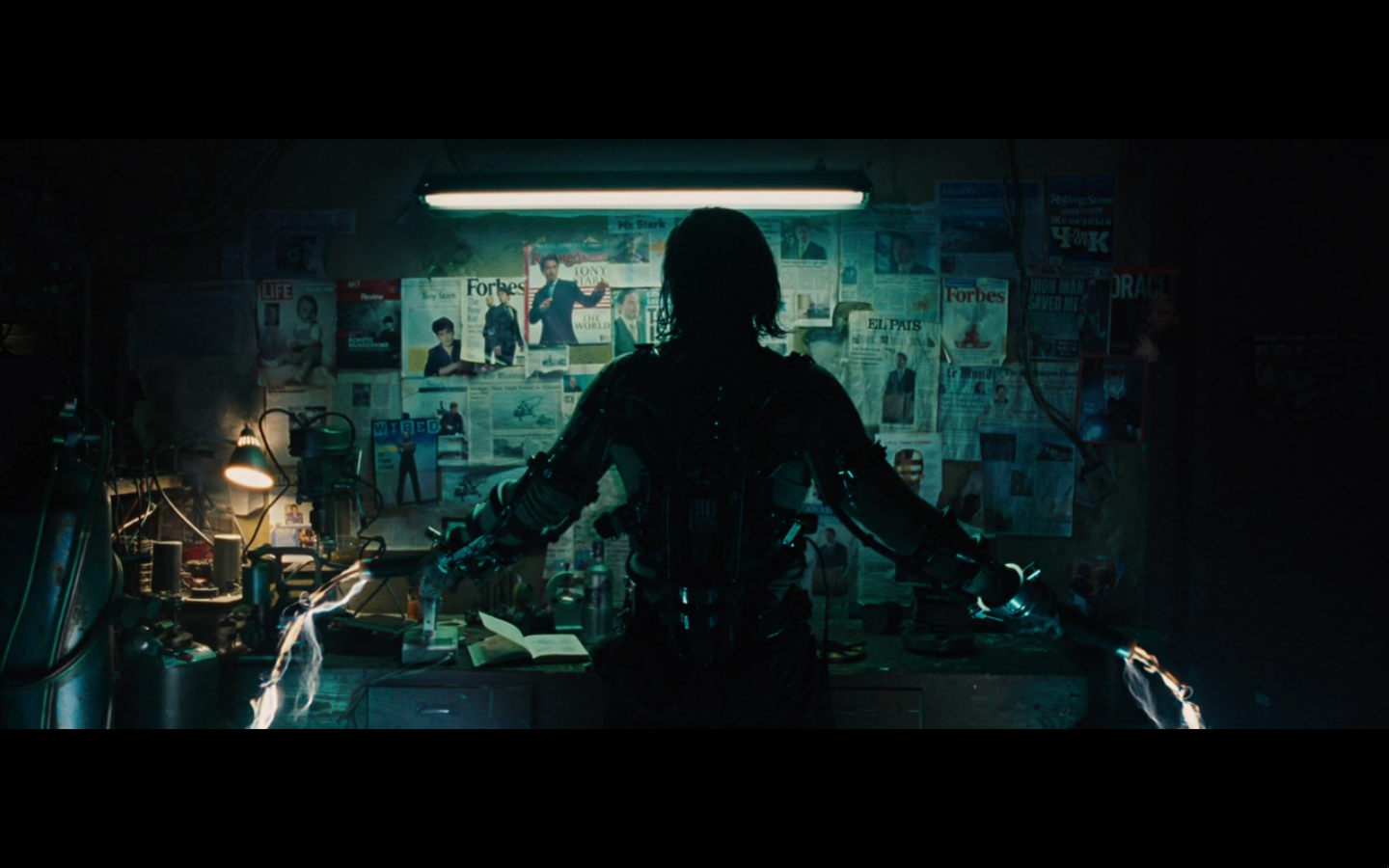 He’s going all John Nash with the pictures and push pins and all that. Did he buy an English copy of Forbes and one from Rolling Stone? Also, the one on the right is from after he became Iron Man, so are we to assume that somewhere in this montage of creating his own arc reactor, he went out and bought a newspaper so he could cut it out and put it up on the bulletin board and look at it? I never understood stuff like this. It’s all intentional, cause you know they have to make all these clippings specially for the film.