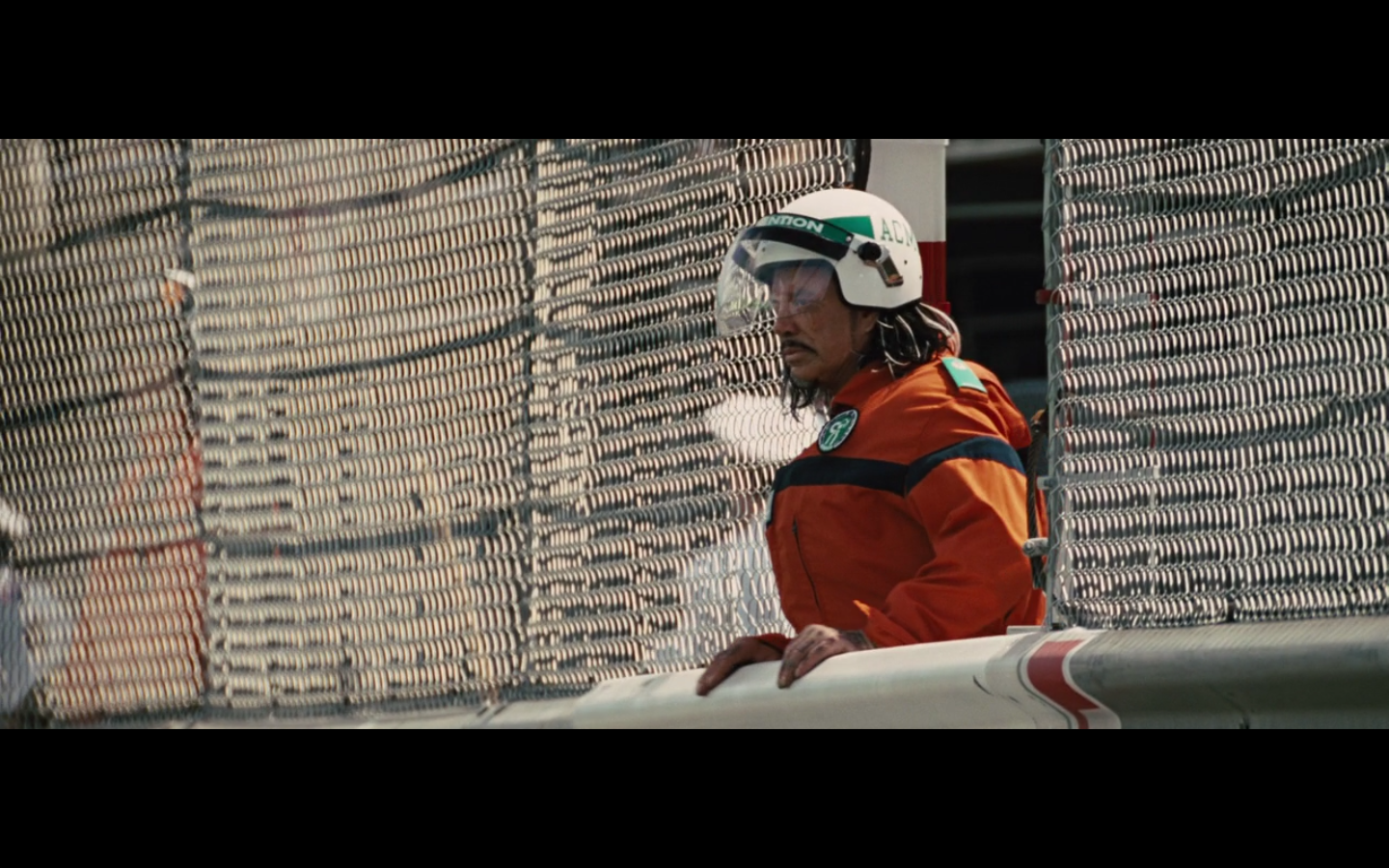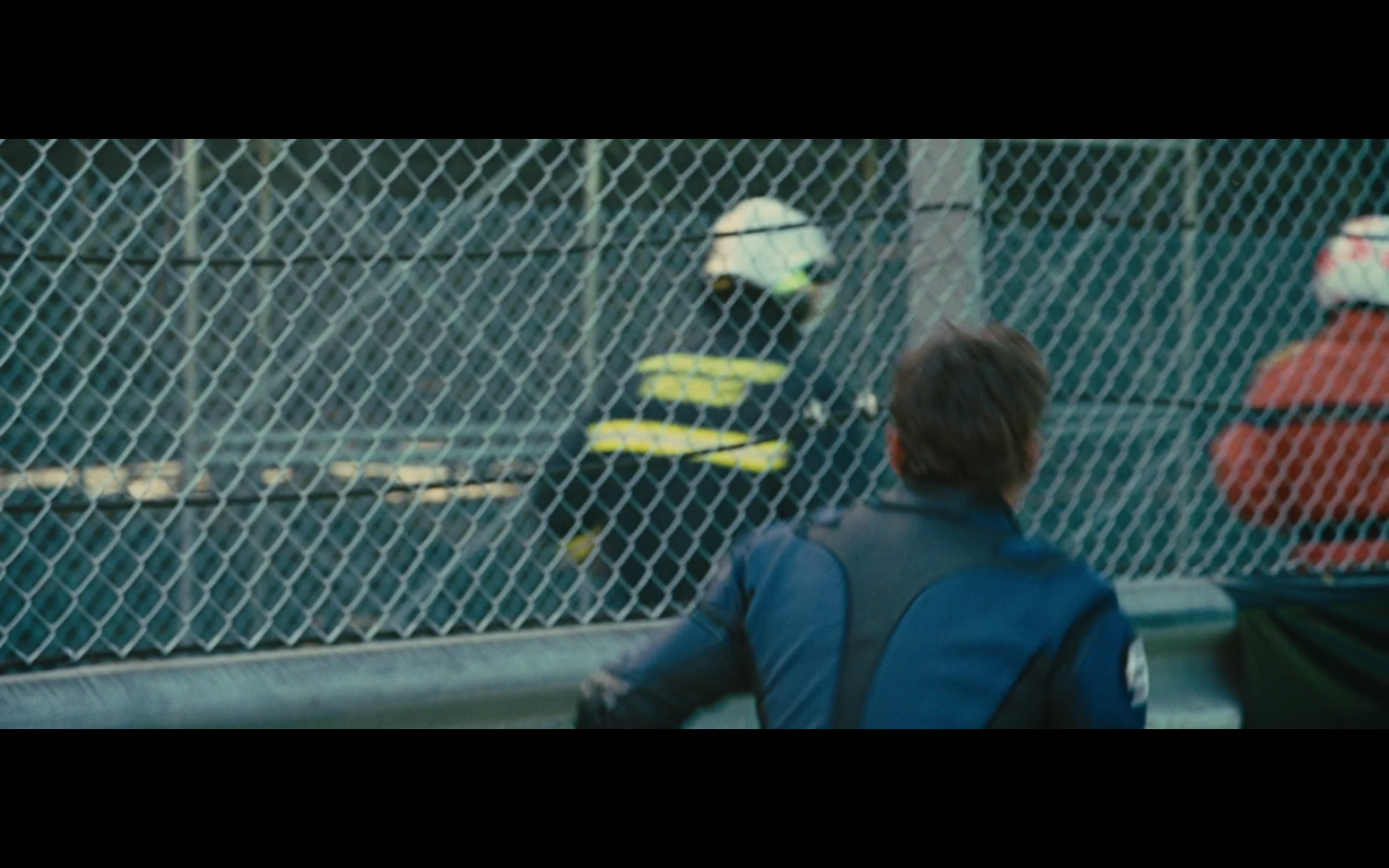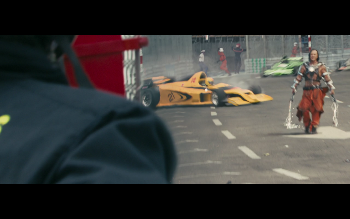 Technically, he’s dressed as a marshal, which means he’s the one who’s supposed to be monitoring the track. Kinda like Javier Bardem dressing as a cop and waltzing through London without being noticed.