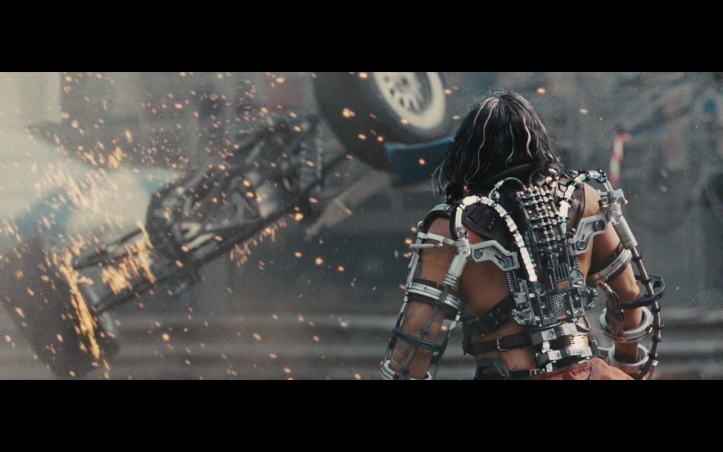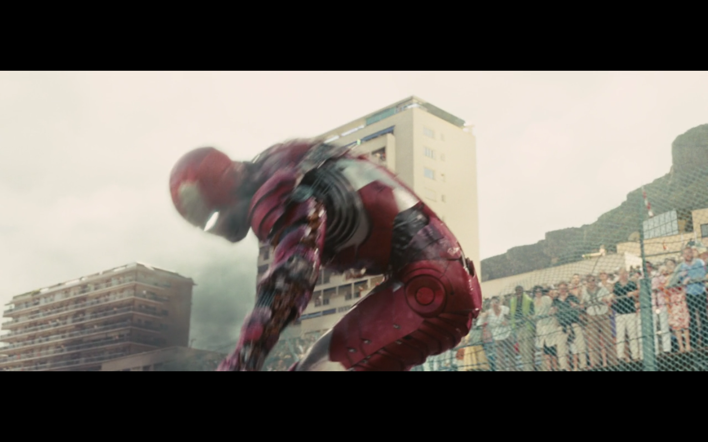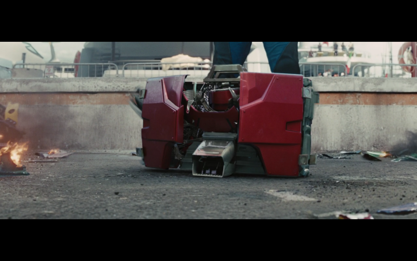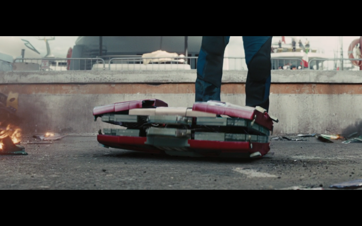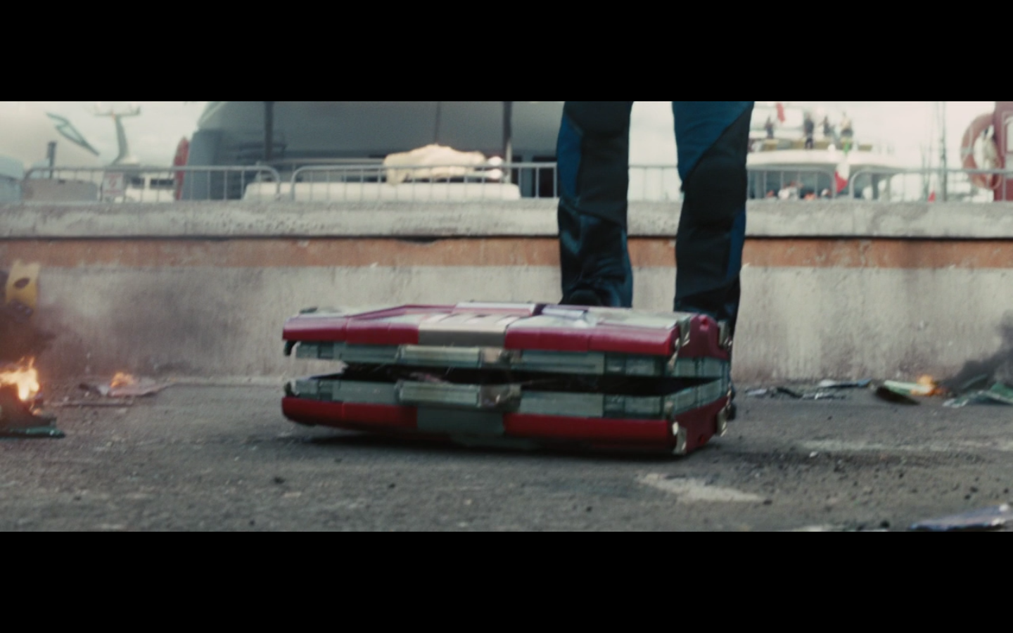 No. She can’t throw that whole thing. She threw that like a piece of Styrofoam. That’s supposed to be a suit that can take a hit from an anti-aircraft gun or an explosion or something. There’s no way it’s made of something light enough that the WHOLE suit in suitcase form could be tossed. They’re just getting ridiculous. It should have been in the trunk.