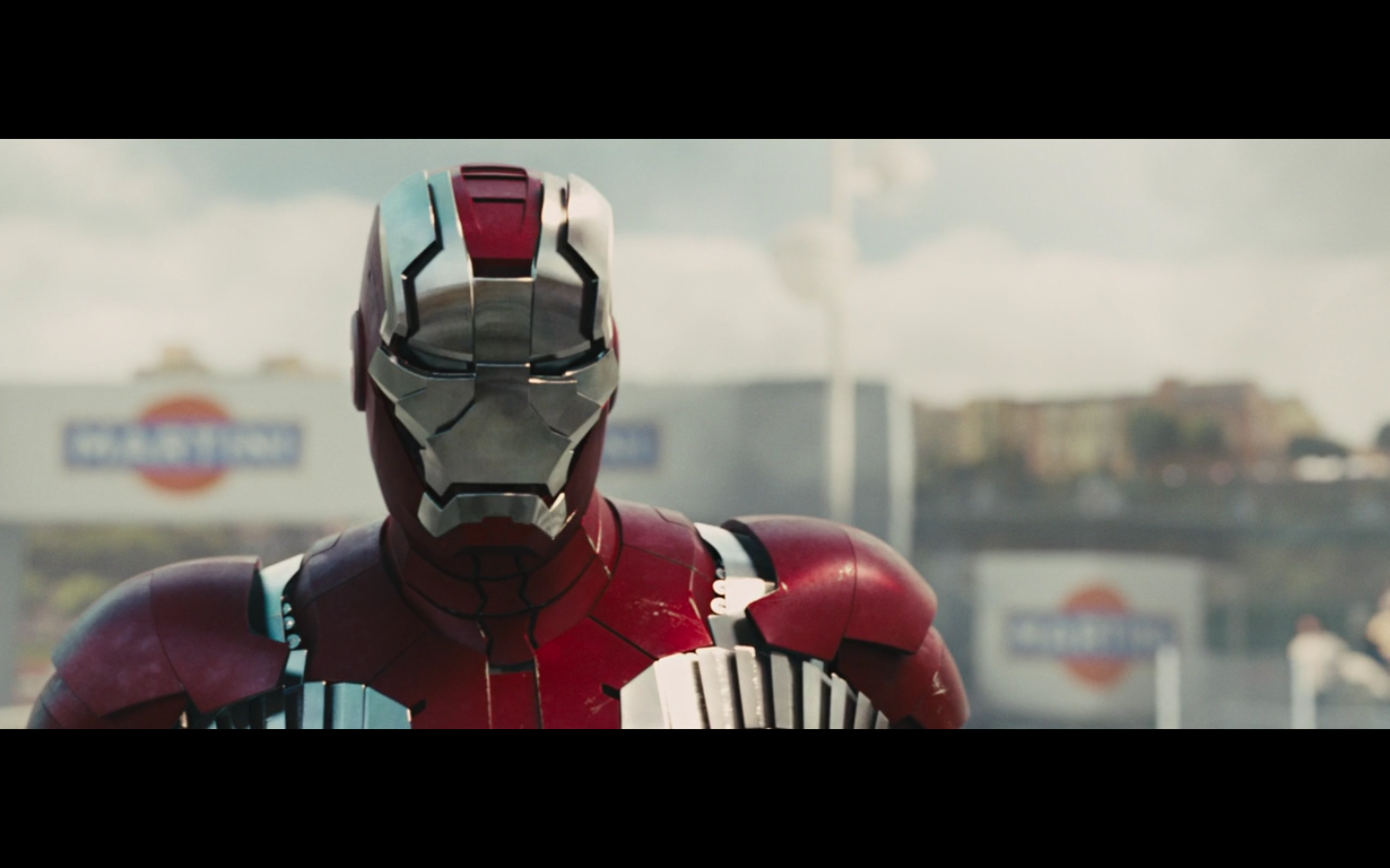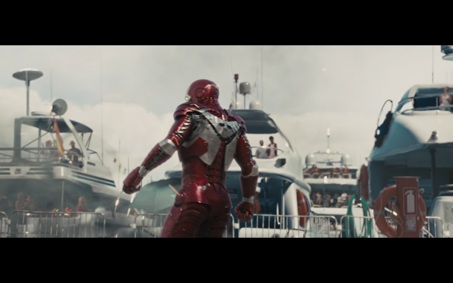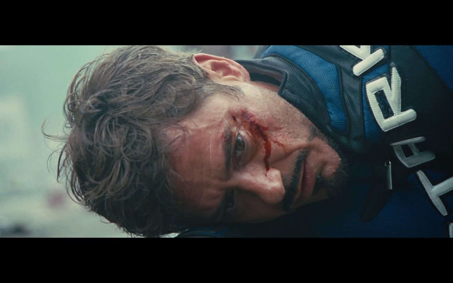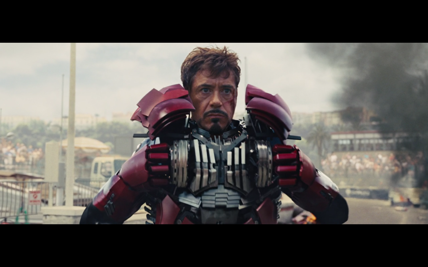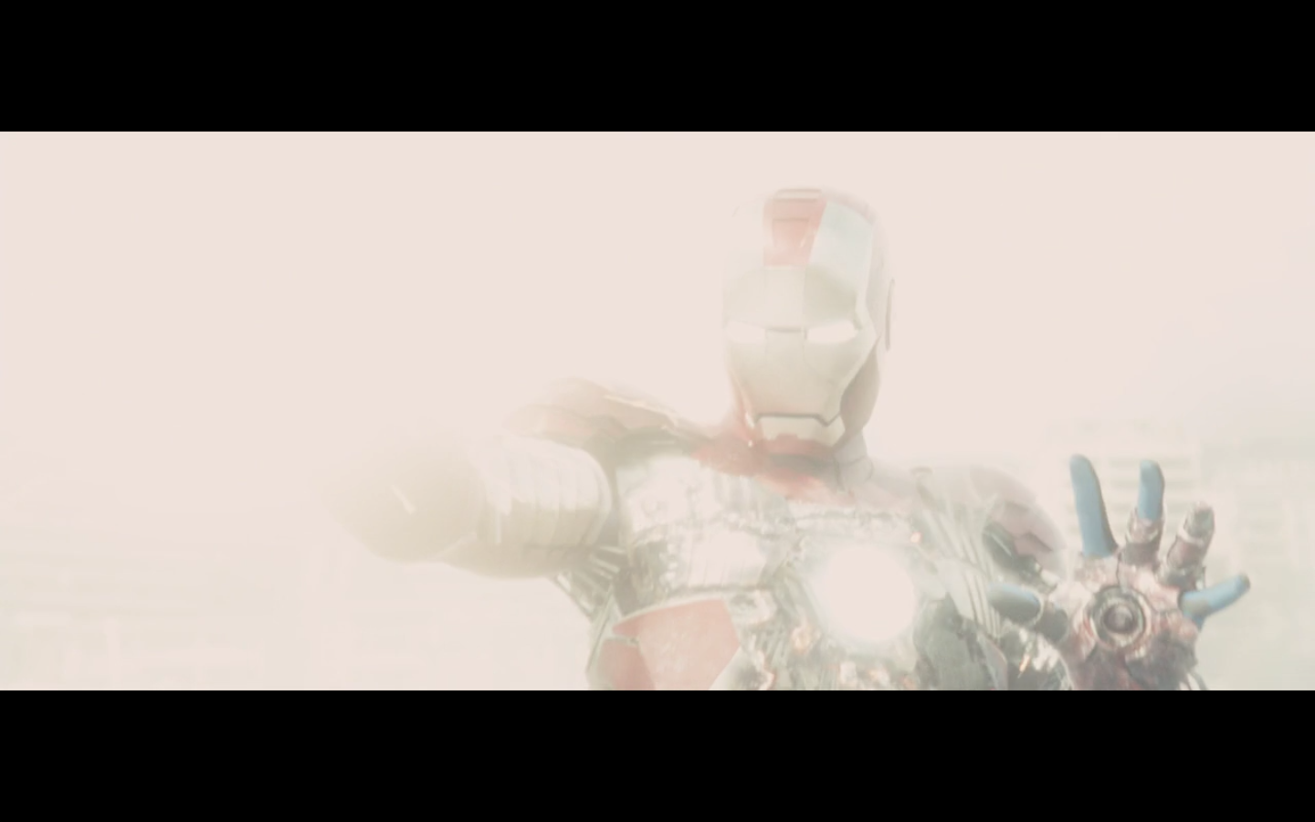 That didn’t really hurt him at all, huh? He’s just looking at it like a math problem. It’s like the only thing we’re supposed to care about is the suit getting a little wrecked up. And later on we see that he has like 10 of them, like Batman. None with nipples, though.