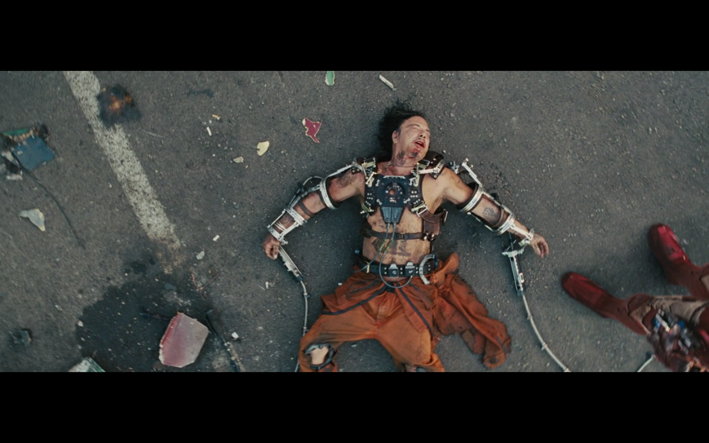 He did just pull Tony off the car pretty hard, and he’s been whipping him around, which suggests that he has the strength to swing the weight of Tony IN the suit around like nothing. I see no prosthesis that’s making him stronger or supporting any of the load. His arms are what make the whip go.