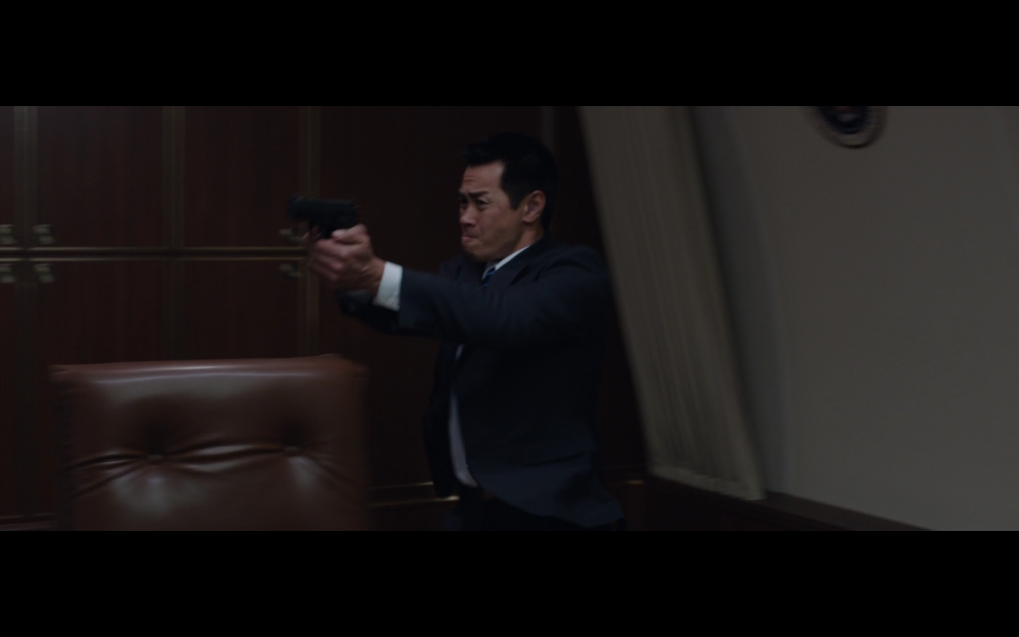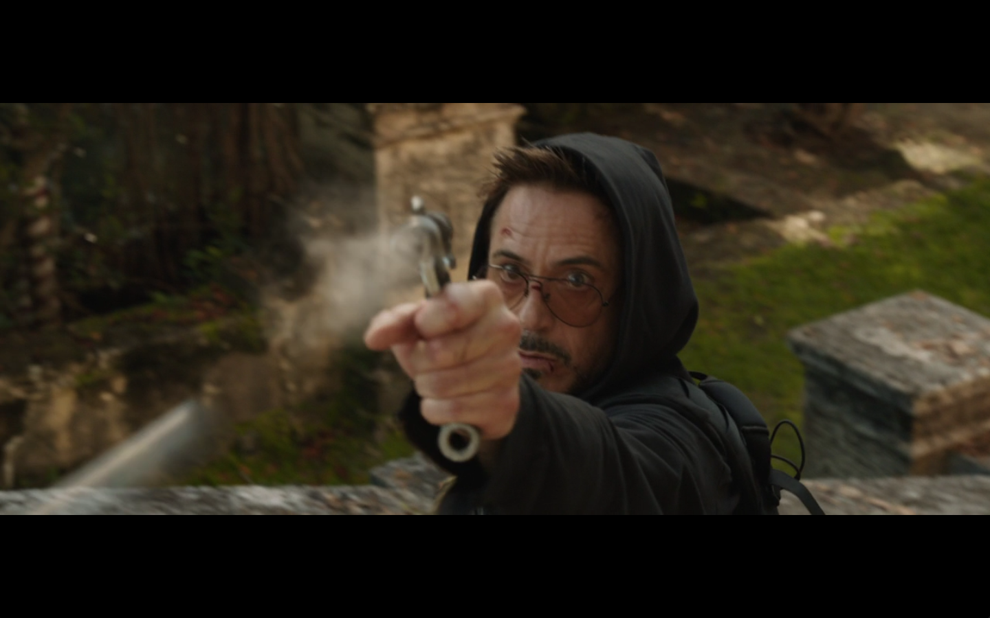 Tropic Thunder. Remember the opening when he’s running and shoots the guy behind his back?