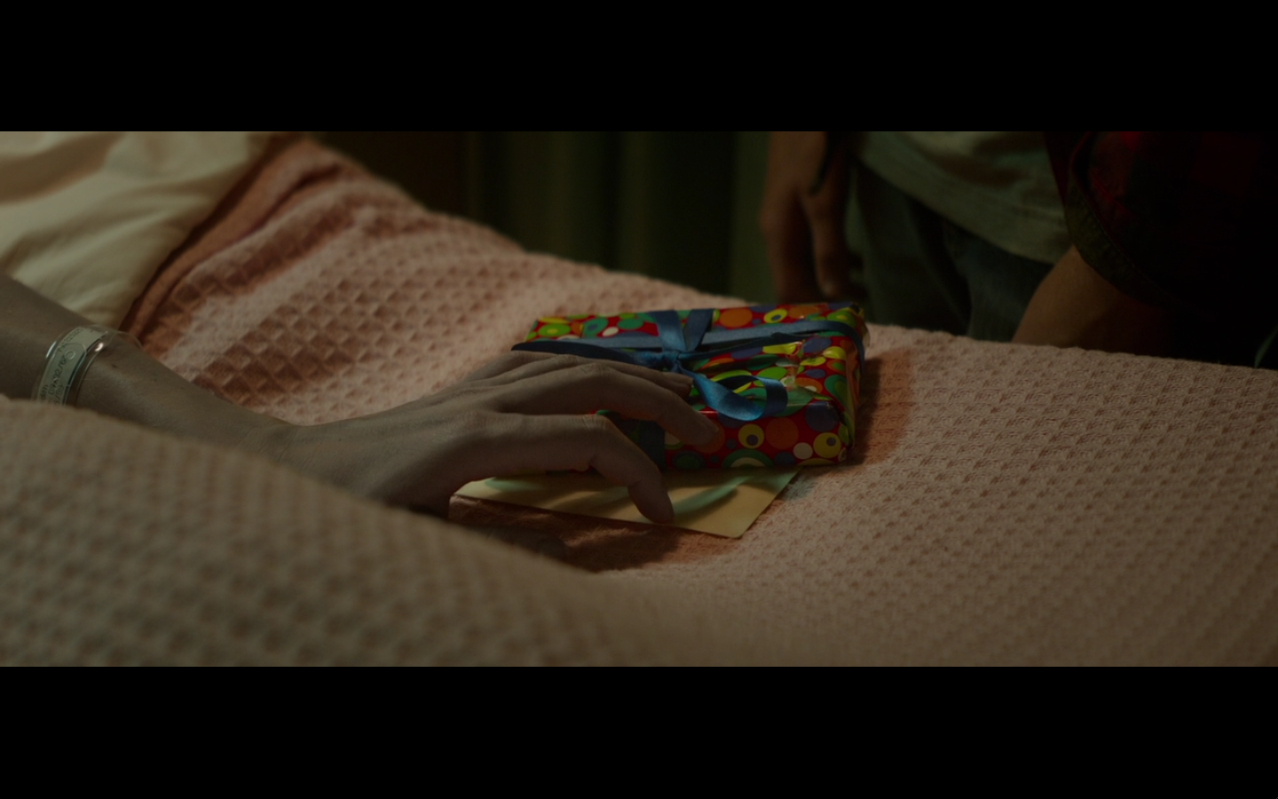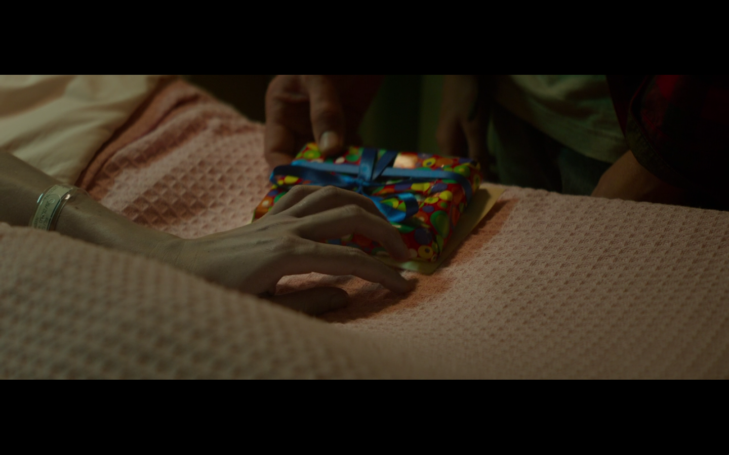Sure, maybe she’s too weak to remember the present or whatever — also, one, to get it out of the way, what a shitty present. “Hey, I’m dying, so listen to this music rather than get an inheritance.” Also, how did she make that tape? Dictated the song list and had someone else do it? “Hey nurse, get in here, stat. I need to know if I should go Bee Gees or Toni Basil for track number 16.” The whole vibe is bizarre. The kid is never gonna see his mother again. Let him spend some fucking time with her. While the rest of you gather around her like it’s Eyes Wide Shut.