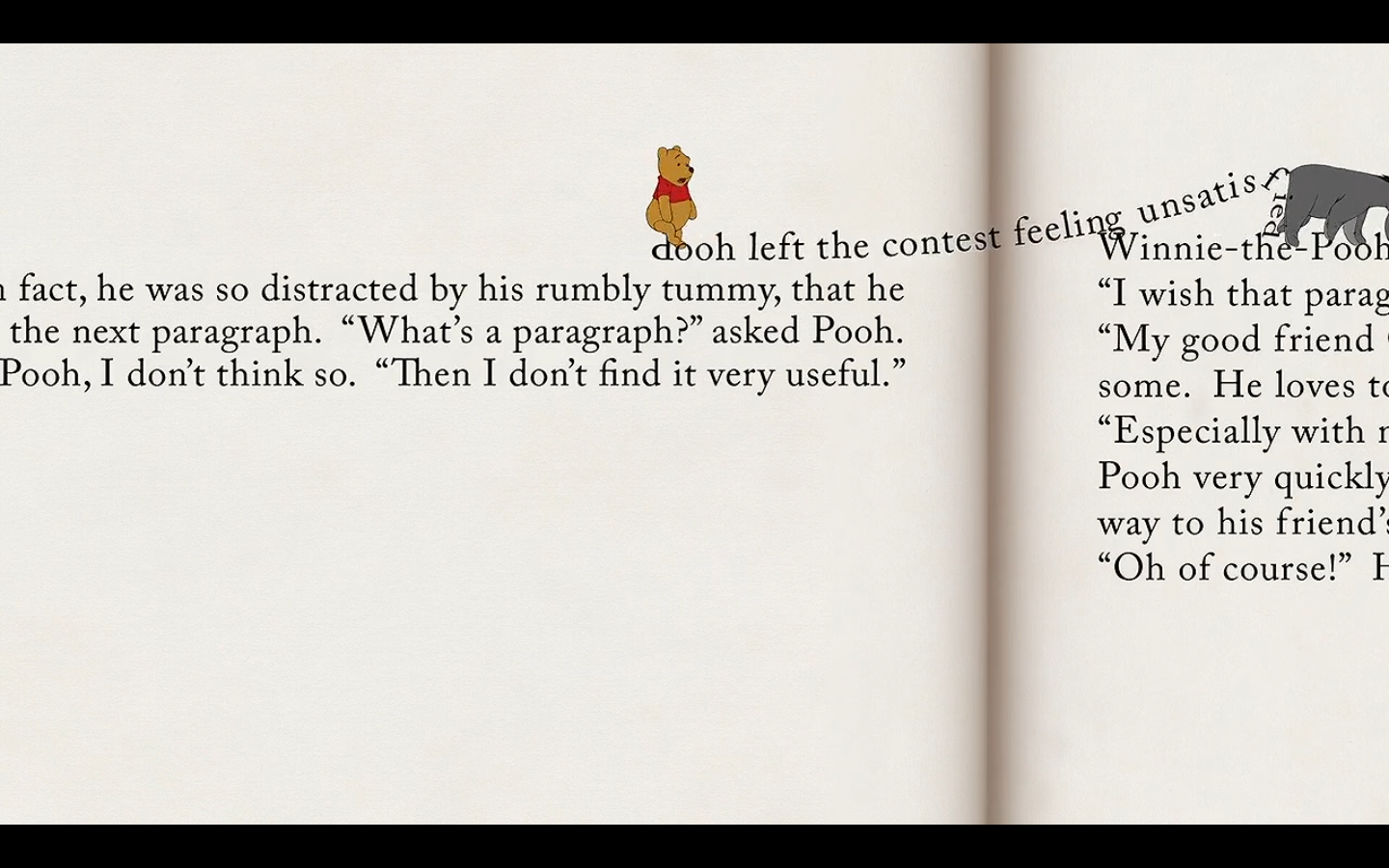 Pic of the Day: “Pooh left feeling unsatisfied and a little out of sorts. In fact, he was so distracted by his rumbly tummy that he didn’t notice that he was walking onto the next paragraph.” “What is a paragraph?” “It’s a group of sentences that form a complete thought.” “Is there honey in this paragraph?” “Oh, sorry, Pooh, no.” “Well then, I don’t find it very useful.”