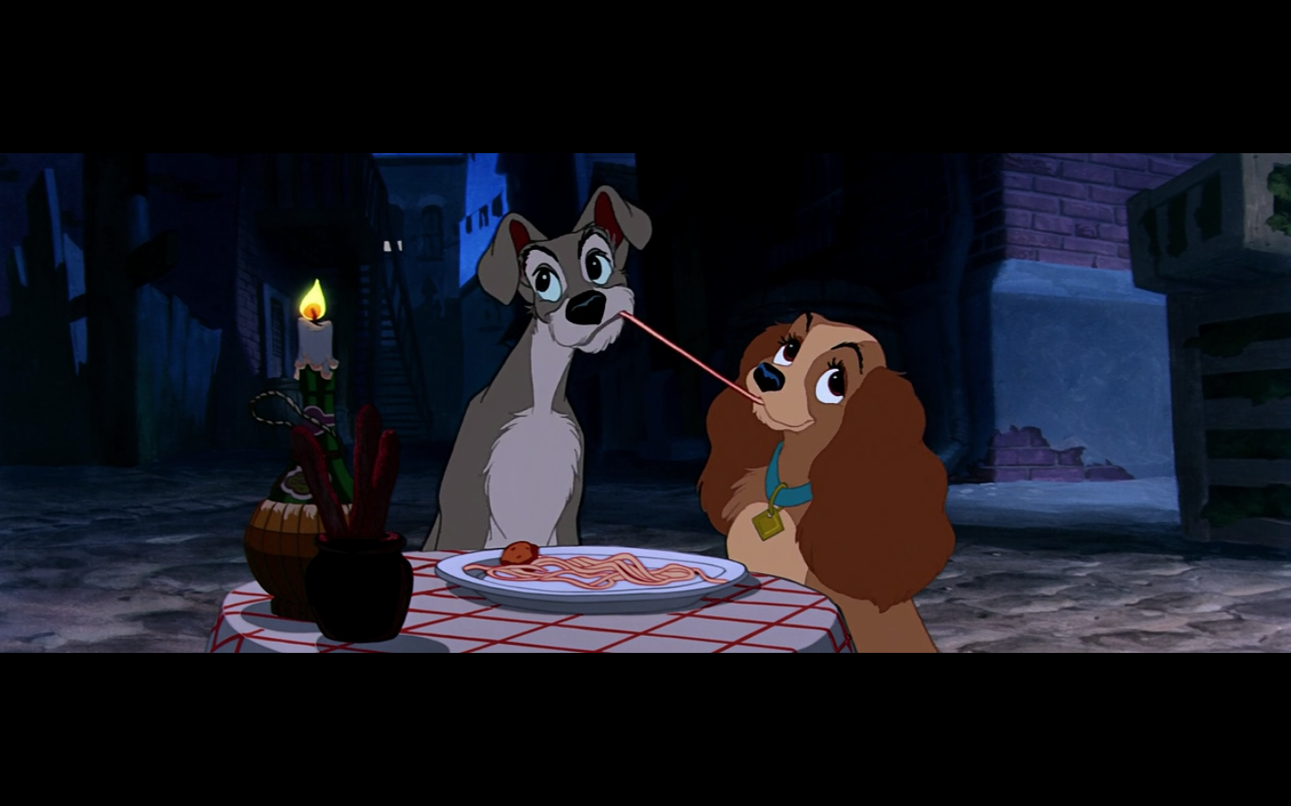 Everyone knows the plot of the film — a stray dog meets a dog from a nice family and they fall in love. The scene above is one of the single most famous scenes in all of cinema.
