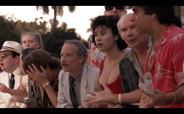 It takes place on a hot summer day in Brooklyn, as racial tensions between the Italian and black communities reach a boiling point. Lee stars as Mookie, a pizza delivery boy, who is sort of the bridge between the two communities, and Danny Aiello plays Sal, owner of the pizzeria. Richard Edson and John Turturro play Aiello’s sons, Rosie Perez plays Lee’s girlfriend, and the people on the block are played by Ruby Dee, Ossie Davis, Giancarlo Esposito, Bill Nunn, Paul Benjamin, Frankie Faison, Robin Harris, Roger Guverneur Smith and Martin Lawrence. You also get little cameos by Frank Vincent, John Savage and Miguel Sandoval, while the whole film is framed/narrated by Samuel L. Jackson, as radio DJ Mister Señor Love Daddy.