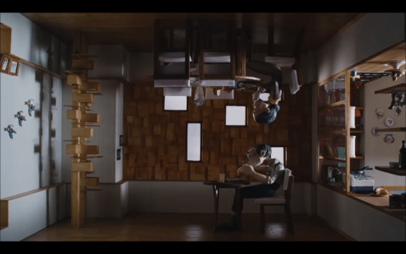 I love this one. What a great idea for a short. Because it’s both entertaining and also is a great metaphor for staleness in a long-lasting marriage. The film is about an older married couple who have grown apart, which is represented through the fact that each lives on a completely different plane of gravity within their house. His reality is one way and hers is upside down from his. And occasionally they interact, but largely they’re living separate lives, together. And the film is about them trying to find a way to keep their marriage together and find that common ground. And how they do it is just absolutely beautiful.