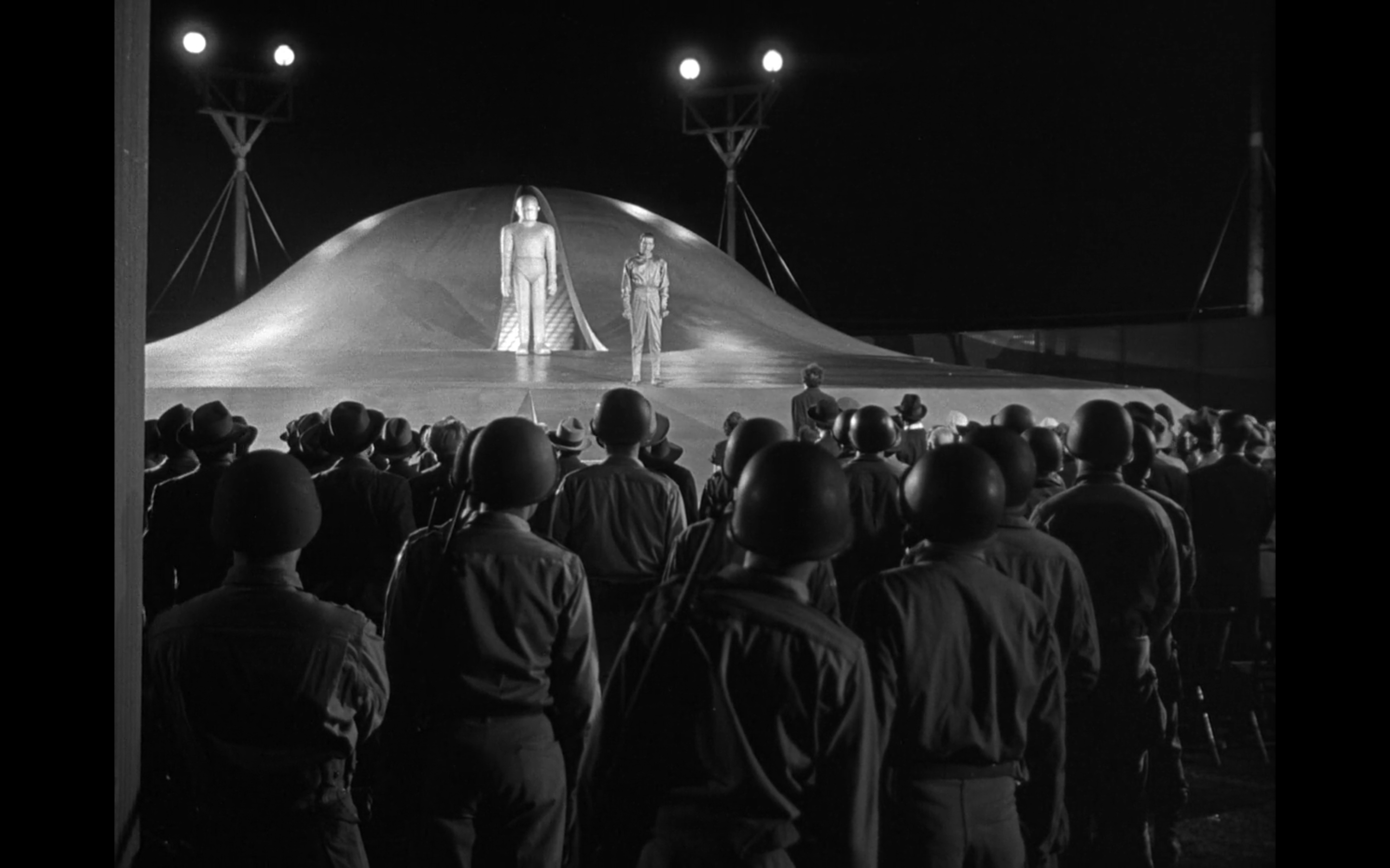 Pic of the Day: “I am leaving soon, and you will forgive me if I speak bluntly. The universe grows smaller every day, and the threat of aggression by any group, anywhere, can no longer be tolerated. There must be security for all, or no one is secure. Now, this does not mean giving up any freedom, except the freedom to act irresponsibly. Your ancestors knew this when they made laws to govern themselves and hired policemen to enforce them. We, of the other planets, have long accepted this principle. We have an organization for the mutual protection of all planets and for the complete elimination of aggression. The test of any such higher authority is, of course, the police force that supports it. For our policemen, we created a race of robots. Their function is to patrol the planets in spaceships like this one and preserve the peace. In matters of aggression, we have given them absolute power over us. This power cannot be revoked. At the first sign of violence, they act automatically against the aggressor. The penalty for provoking their action is too terrible to risk. The result is, we live in peace, without arms or armies, secure in the knowledge that we are free from aggression and war. Free to pursue more… profitable enterprises. Now, we do not pretend to have achieved perfection, but we do have a system, and it works. I came here to give you these facts. It is no concern of ours how you run your own planet, but if you threaten to extend your violence, this Earth of yours will be reduced to a burned-out cinder. Your choice is simple: join us and live in peace, or pursue your present course and face obliteration. We shall be waiting for your answer. The decision rests with you.” (70th Anniversary)